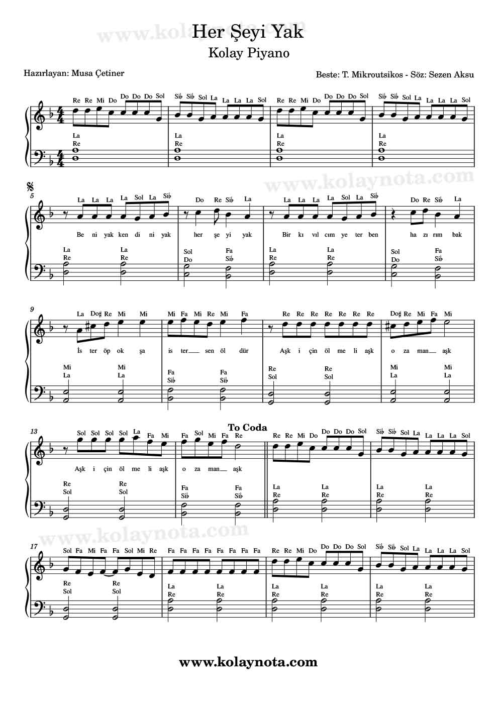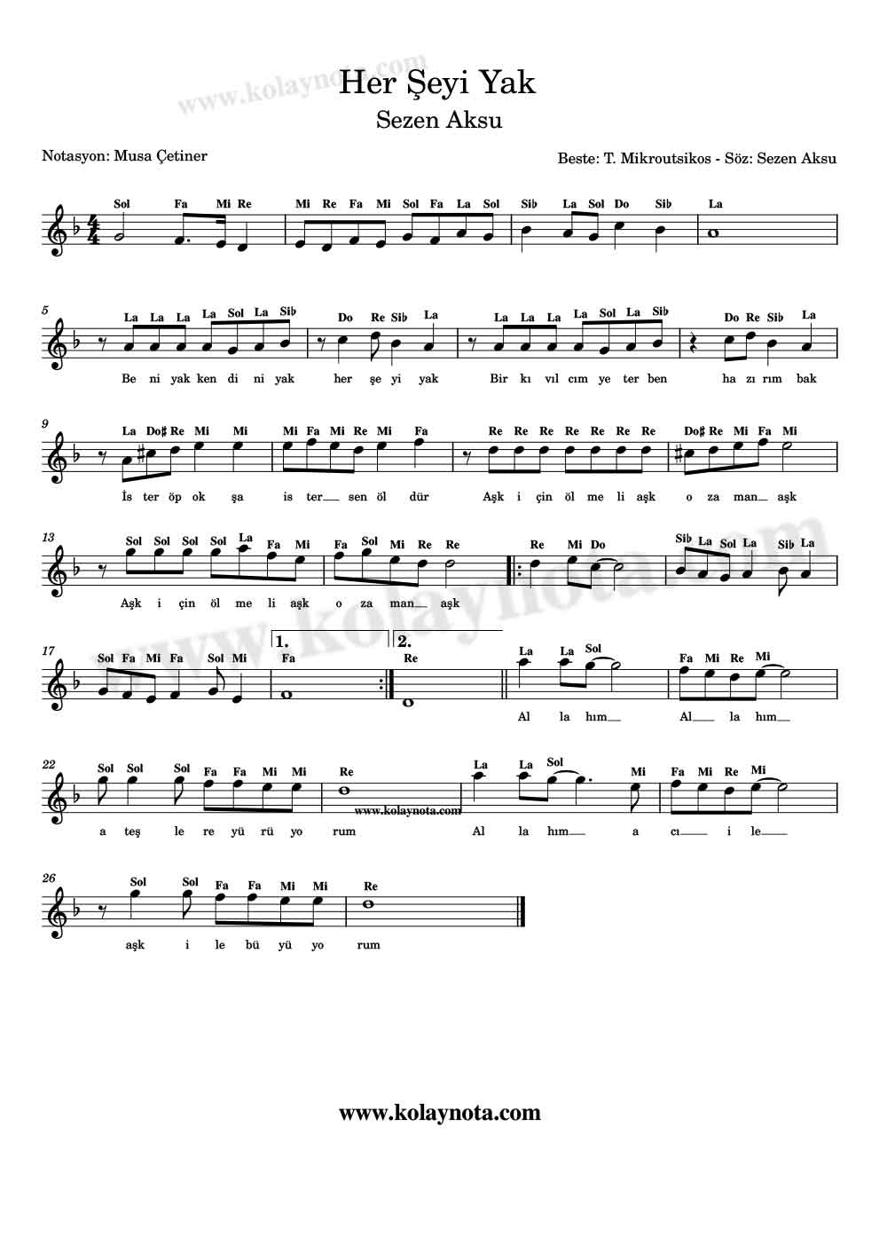 Her Şeyi Yak; Duman grubunun da yorumladığı bir Sezen Aksu şarkısı. Şarkının bestecisi T. Mikroutsikos, söz yazarı ise Sezen Aksu. Do Re Mi ve Kolay notasını paylaşacağım. Do Re Mi nota La minör tonunda, Kolay notası ise Re minör tonunda. Sezen Aksu şarkıyı Re Minör tonunda yorumlamış.