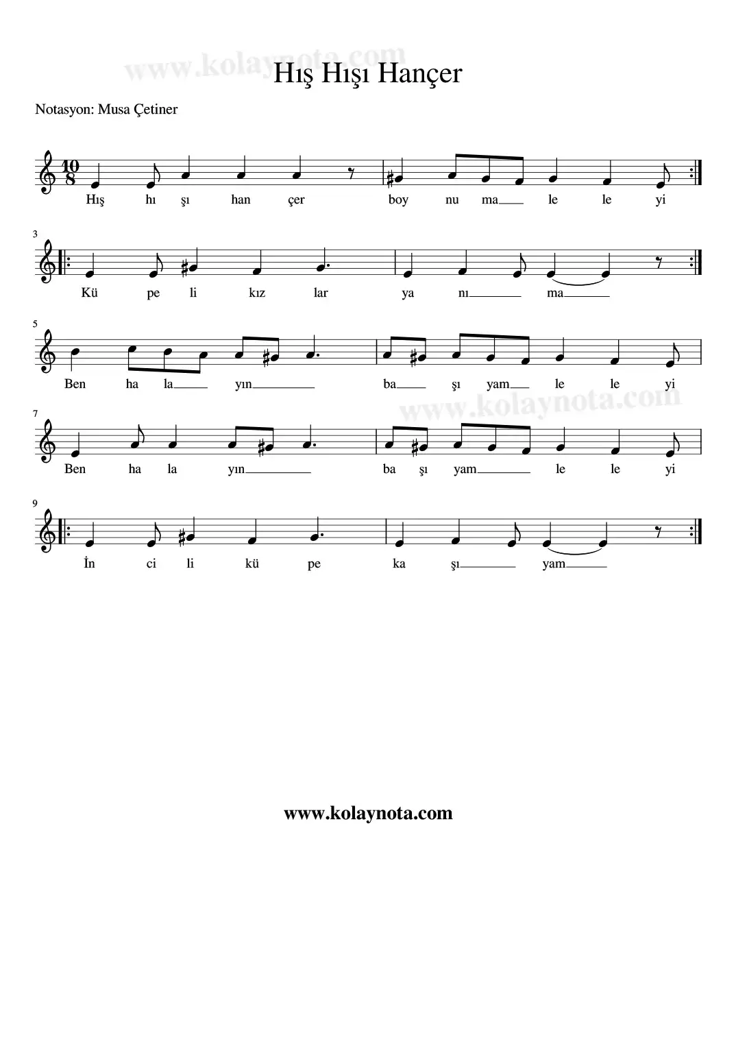 Hış Hışı Hançer, Gaziantep yöresine ait, Hicaz makamında bir türkü. Kaynak kişisi Azmi Körükçü. Mi karar sesinde Do Re Mi, La Karar sesinde kolay notasını hazırladım. Bağlama çalan arkadaşlar kolay notayı çalmalılar