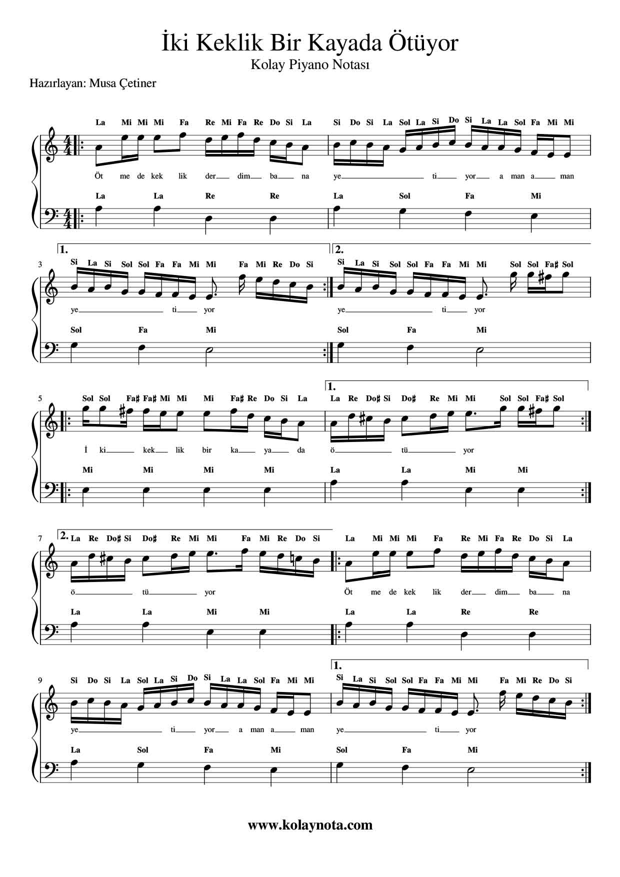 İki Keklik; Balıkesir yöresine ait bir türkü. Kolay piyano biçiminde düzenledim. Pdf ve jpg formatında notaları görüntüleyebilir, videosu sayesinde çalınış hakkında fikir sahibi olabilirsiniz. Piyano çalmayı yeni öğreniyor ve türküleri seviyorsanız çalmayı deneyebilirsiniz. Başarılar.