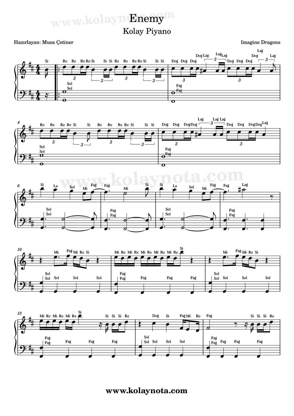 Enemy; Imagine Dragons ve J.I.D ortak çalışması olan bir şarkı. Si minör tonunda yorumlanmış, aynı tonda Kolay Piyano düzenlemesini hazırladım. Sol elde kolayca çalabileceğiniz bir eşlik var.