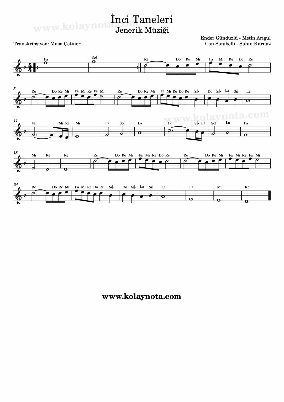 İnci Taneleri, Nota. Senaryosunu Yılmaz Erdoğan’ın yazdığı dizinin Jenerik müziğini notaya aldım bu yazı için. Şarkının bestecileri olarak Ender Gündüzlü, Metin Arıgül, Can Sanıbelli ve Şahin Kurnaz görünüyor. Re minör tonunda bir melodi, aynı tonda yazdım. Kolay Nota ve Piyano düzenlemesini görebilirsiniz.