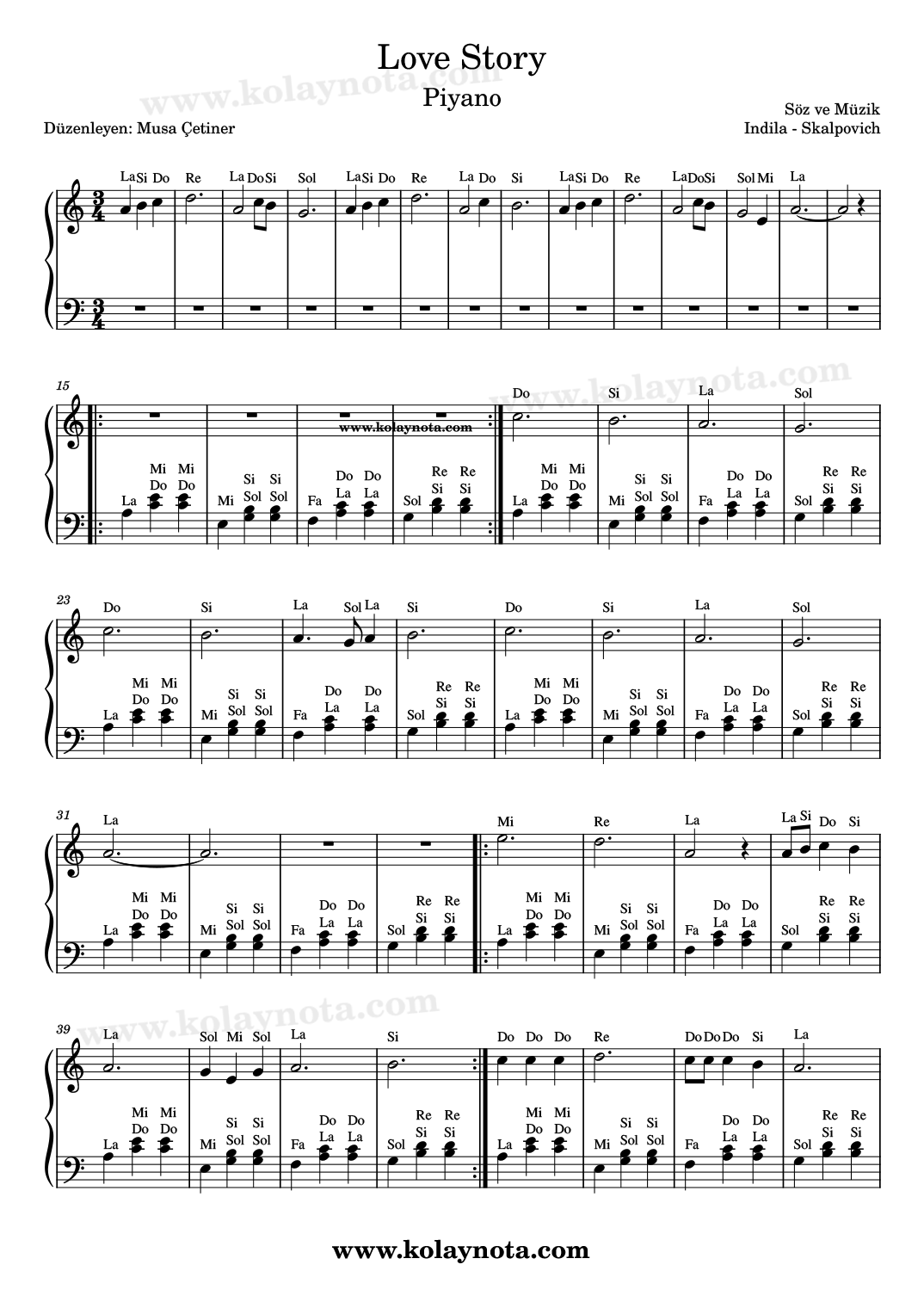 Love Story, Nota. Indila’nın bir şarkısı. Sözü ve müziği Indila – Skalpovich tarafından yazılmış. La minör tonunda kolay nota ve piyano düzenlemesini hazırladım. Notasyonu keman, melodika, flüt, org gibi çalgılarda çalabilir, PDF ve imaj biçiminde görüntüleyebilirsiniz.