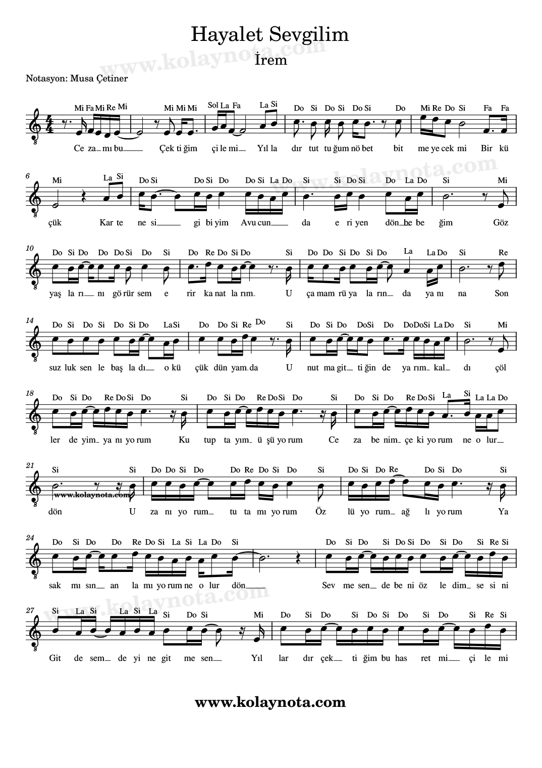 Hayalet Sevgilim, Nota. İrem’in çok sevilen bir şarkısı. Sanatçının 2006 yılında çıkan aynı adlı albümünde yer almış. Mi minör tonunda yorumlanmış, ben La minör tonunda notaya aldım. Kolay Nota ve Piyano düzenlemesini görebilirsiniz. Keman, melodika, flüt, org gibi çalgılarda çalabilir, notasyonu PDF ve imaj biçiminde görüntüleyebilirsiniz.