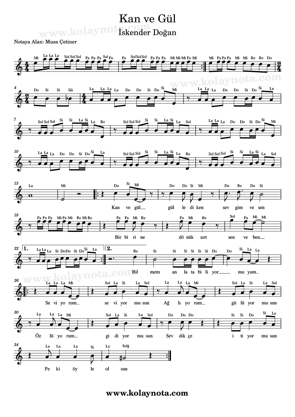 Kan ve Gül, Nota. İskender Doğan’ın çok sevilen bir şarkısı. Sözü ve müziği kendisine ait. Sanatçının 1975 yılında çıkan plağında yer almış. Kıraç’da seslendirmişti bu güzel şarkıyı. La minör tonunda notaya aldım. Keman, melodika, flüt, org, piyano gibi çalgılarda çalabilir, PDF ve imaj biçiminde görebilirsiniz.