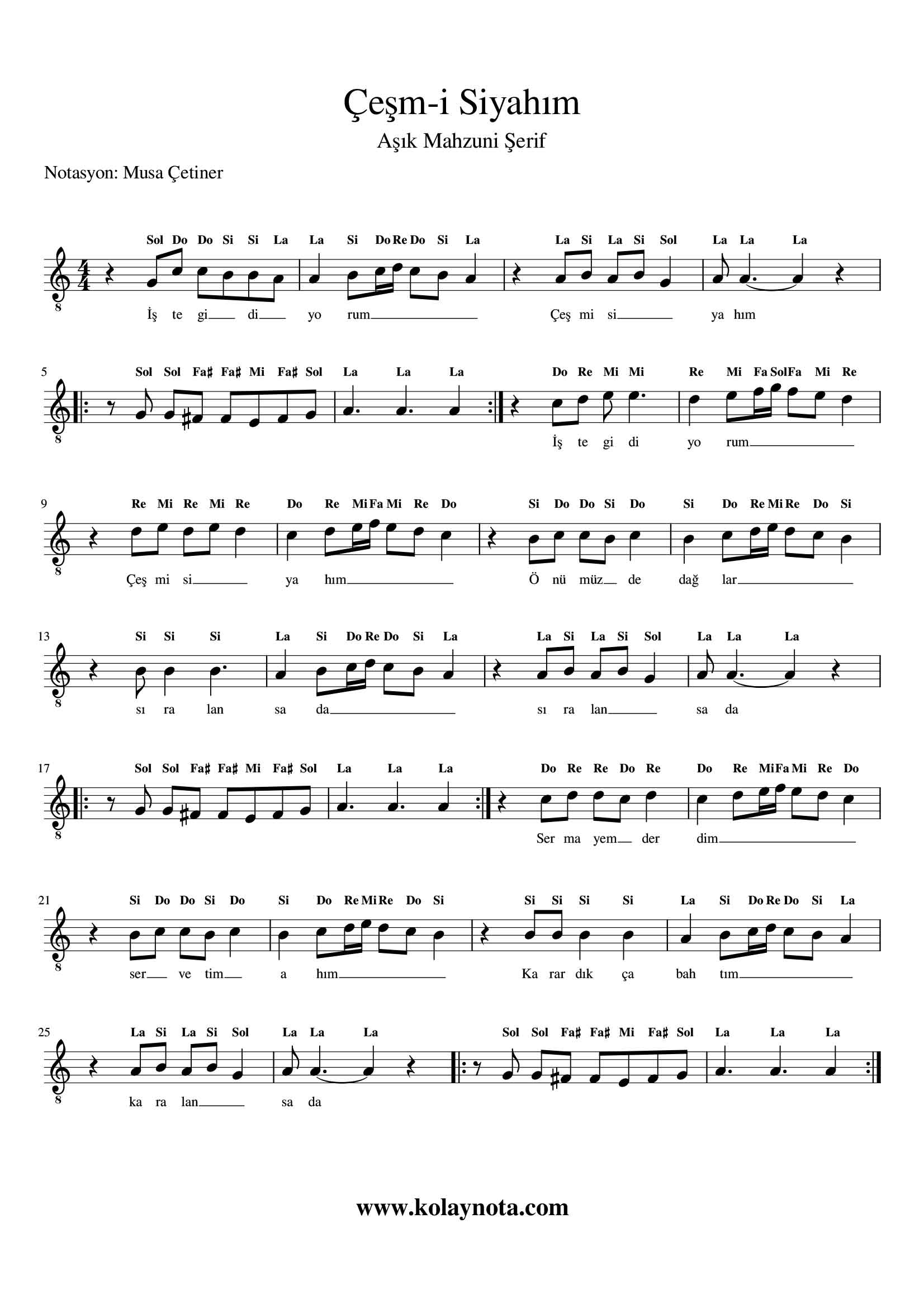 İşte Gidiyorum Çeşm-i Siyahım Notaları