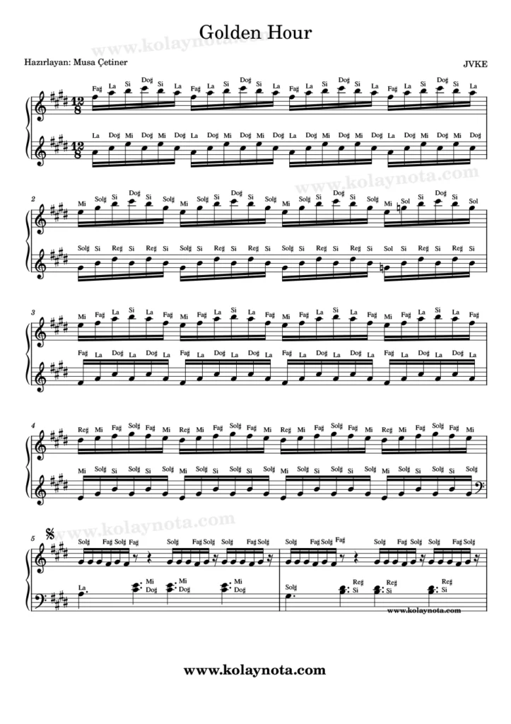 Golden Hour, Nota. JVKE’nin bir şarkısı. Piyano ağırlıklı bir şarkı. Orjinal tonda sadeleştirilmiş düzenlemesini hazırladım. Sadece giriş bölümünü değiştirmedim, orası şarkıyla aynı. Sözlü bölümde de akorlu bir eşlik var. Orjinal tonda olduğu için siyah tuşları bol bol kullanmanız gerekecek. Notasyonu PDF ve imaj biçiminde görebilir, piyano videosunu izleyebilirsiniz.