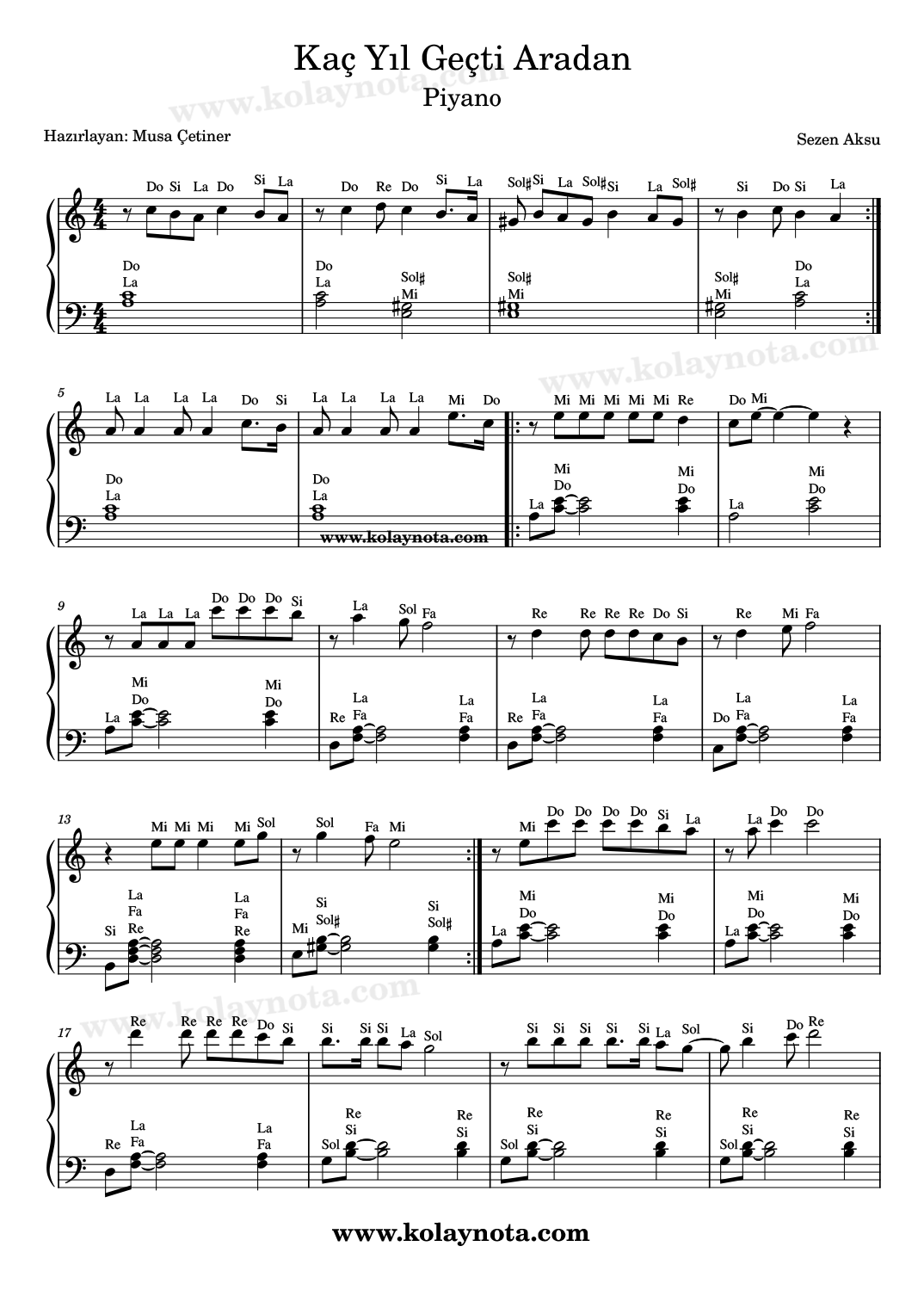 Sezen Aksu’nun bu güzel şarkısını paylaşacağım bu yazıda. Do Re Mi ve kolay nota olarak görebilirsiniz. Şarkının sözü ve müziği yine Sezen Aksu’ya ait. Notasyonları La minör tonunda hazırladım. Melodika, keman, org, flüt gibi çalgılarda çalabilirsiniz. Başarılar.