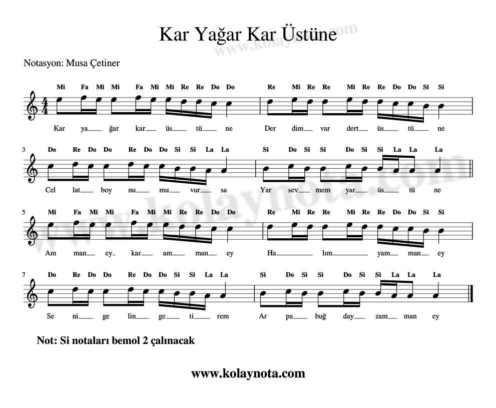 Kar Yağar Kar Üstüne; Diyarbakır yöresine ait, İzzet Altınmeşe‘nin derlediği bir türkü. Do Re Mi notalar ve kolay notasını paylaşacağım. Do Re Mi notası re karar, kolay notası la karar yazıldı. Bağlama çalan arkadaşlar kolay notasını çalmalılar ve si notalarını bemol 2 çalmalılar.