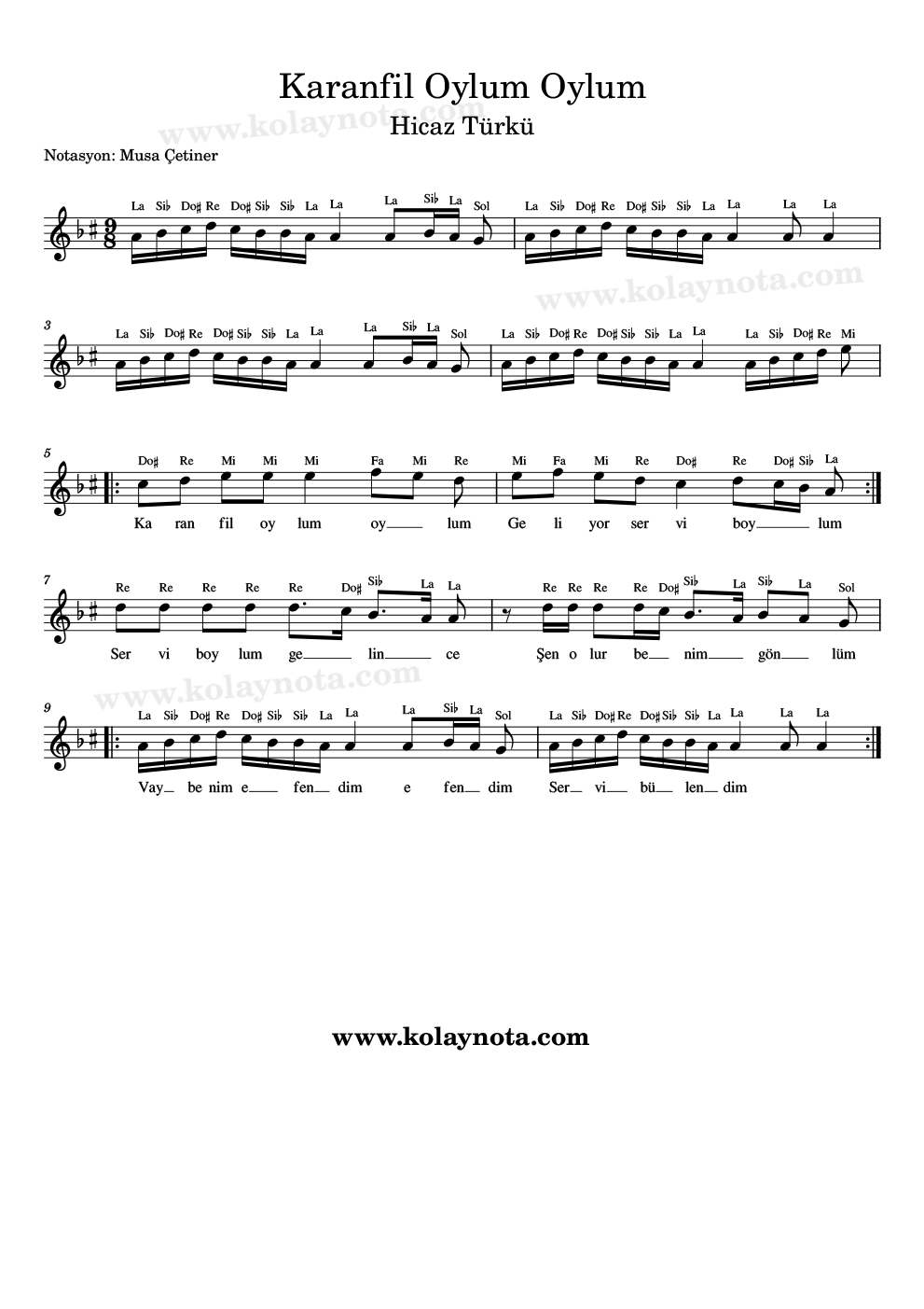 Karanfil Oylum Oylum, Nota. Hicaz makamında ve sanırım İstanbul yöresine ait bir türkü. La Karar sesinde notaya aldım. Keman, bağlama, melodika, flüt, org, ud, piyano gibi çalgılarda çalabilir, PDF ve imaj biçimlerinde görüntüleyebilirsiniz.