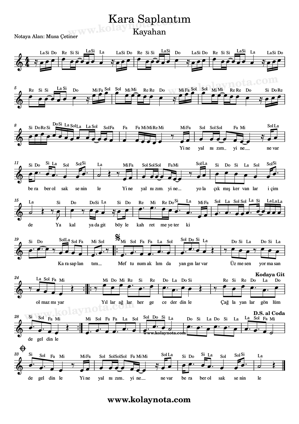 Kara Saplantım, Nota. Kayahan’ın bir şarkısı, sözü ve müziği kendisine ait. Si minör tonunda yorumlanmış, ben La minör tonunda notaya aldım. Keman, piyano, melodika, flüt, org gibi çalgılarda çalabilirsiniz. Notasyonu PDF ve imaj biçiminde görebilir, notayı dinleyebilirsiniz.