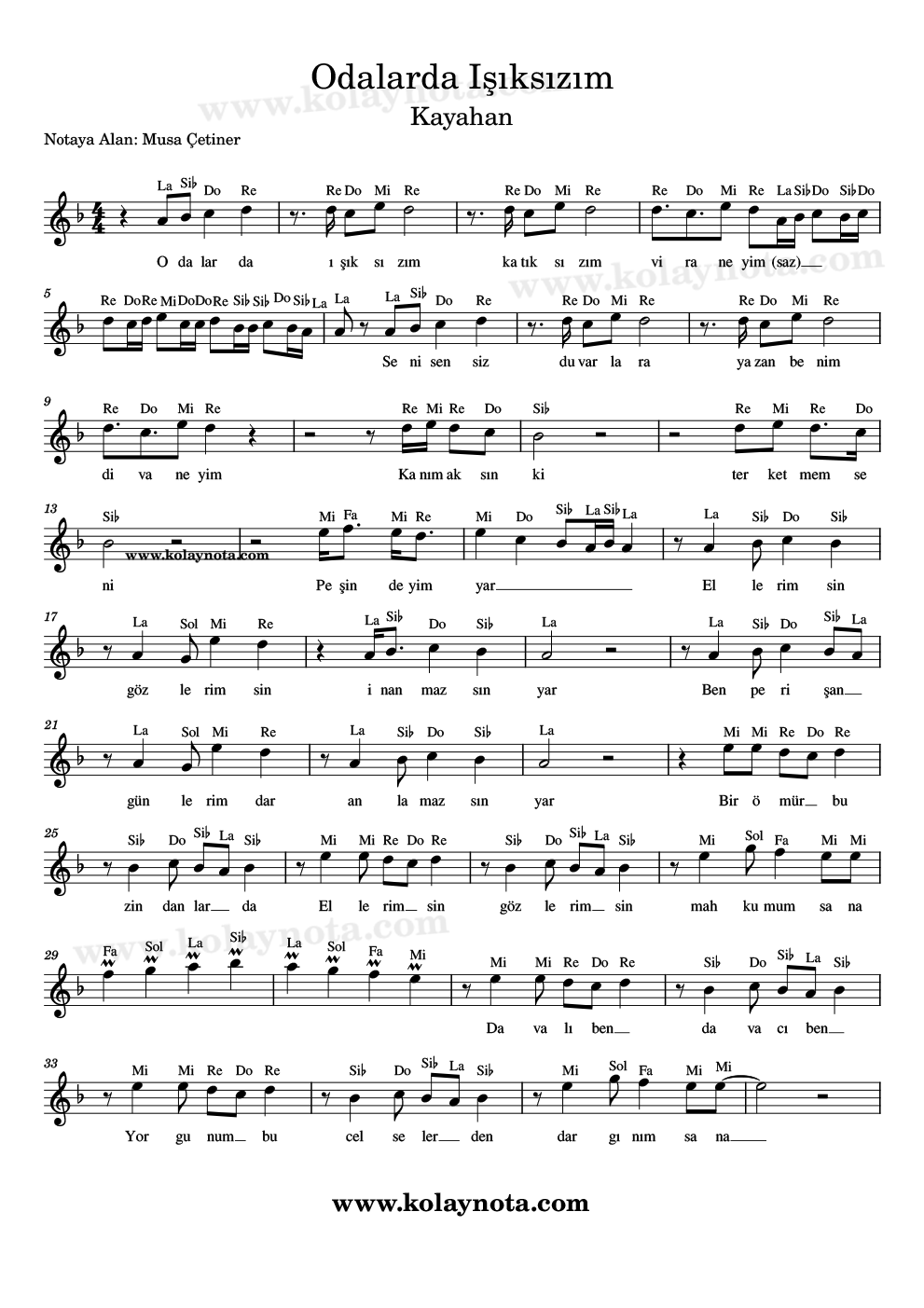 Odalarda Işıksızım – Kolay Nota by Musa Çetiner
