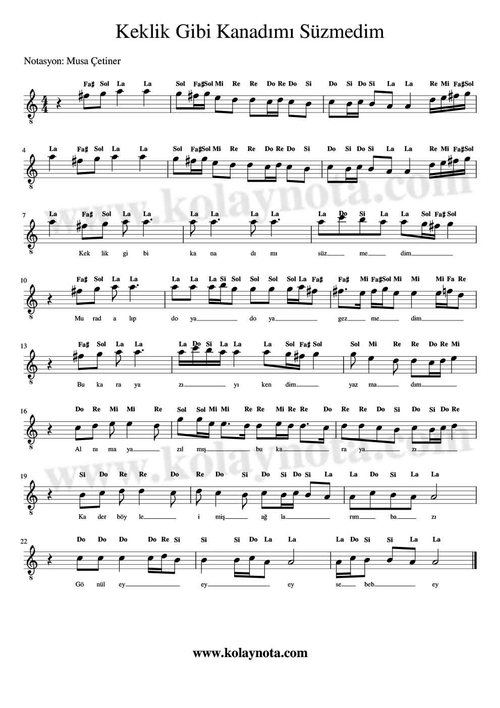 Keklik Gibi Kanadımı Süzmedim; Erzincan yöresine ait ve kaynak kişisi Salih Dündar olan bir türkü. Türküyü günümüze kadar birçok sanatçı okudu fakat Kıraç’ın yorumu benim için ilk başta geliyor. 2 versiyon ekleyeceğim bir tanesi la karar diğeri ise re karar. Notaları melodika, keman, flüt, bağlama gibi çalgılarda çalabilirsiniz. Bağlama çalıyorsanız la karar versiyonu çalmalısınız. Başarılar.