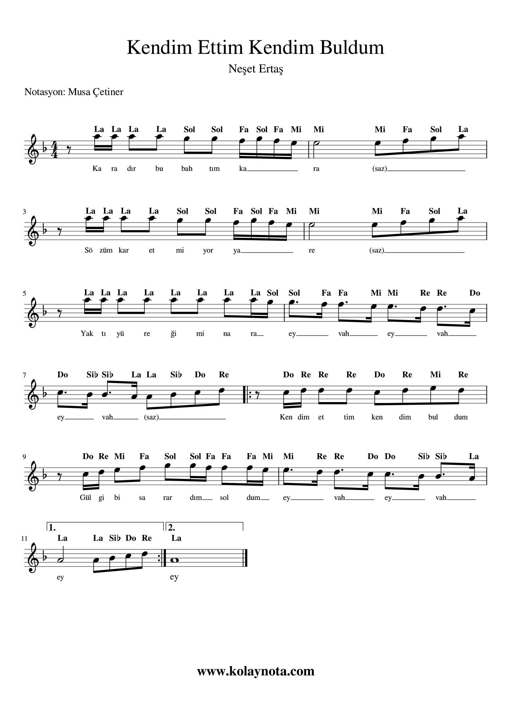 Kendim Ettim Kendim Buldum bir Neşet Ertaş türküsü. Kolay bağlama notalarını paylaşacağım. Nota isimleri notaların üzerinde yazıyor. Bu sayede türküyü daha kolay çözebileceğinizi düşünüyorum. Notayı jpg biçiminde paylaşacağım. Soru, görüş, öneri ve istekleriniz varsa yorumlara yazabilirsiniz. Başarılar.