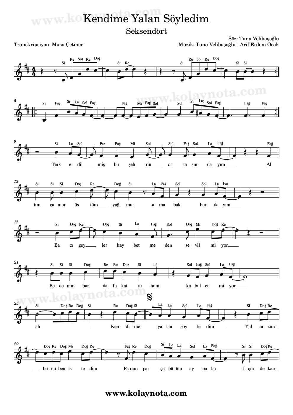 Kendime Yalan Söyledim; Seksendört grubunun bir şarkısı. Tuna Velibaşoğlu ve Arif Erdem Ocak tarafından yazılmış. Si minör tonunda bir şarkı, aynı tonda kolay notasını hazırladım. Nota videosunu da ekleyeceğim, izleyip doğru bir şekilde çalışabilirsiniz.