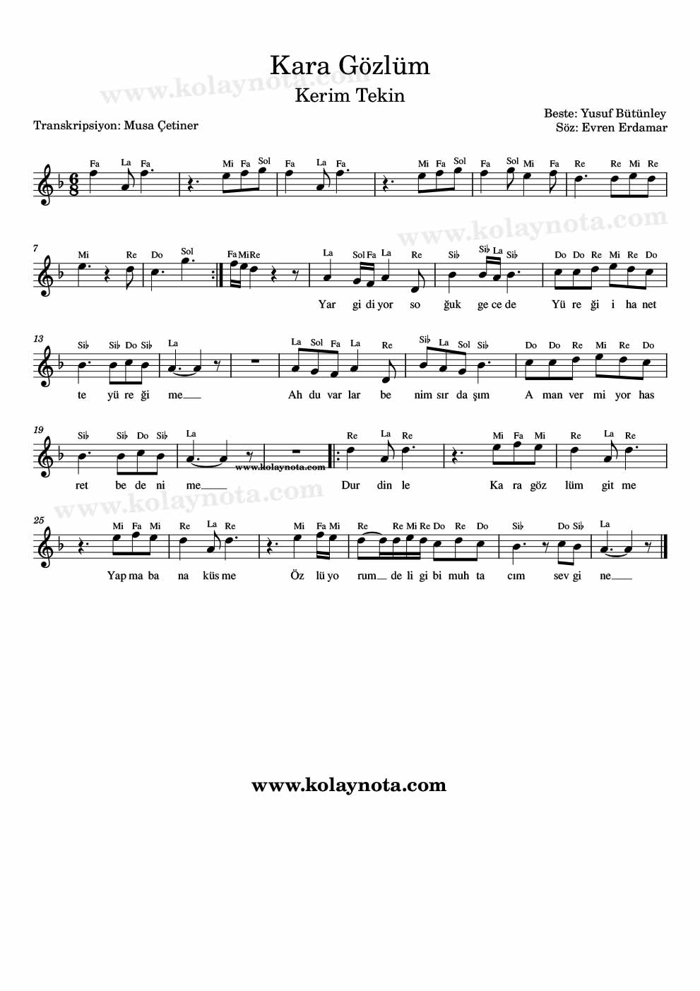 Kara Gözlüm, Nota. Kerim Tekin’in bir şarkısı. Sözleri Evren Erdamar, bestesi Yusuf Bütünley’e ait. Şarkı 1995 yılında piyasaya çıkmış ve sanatçının aynı adlı albümünde yer almış. Re minör tonunda yorumlanmış, aynı tonda notaya aldım. Do Re Mi ve Kolay notasını görebilirsiniz.