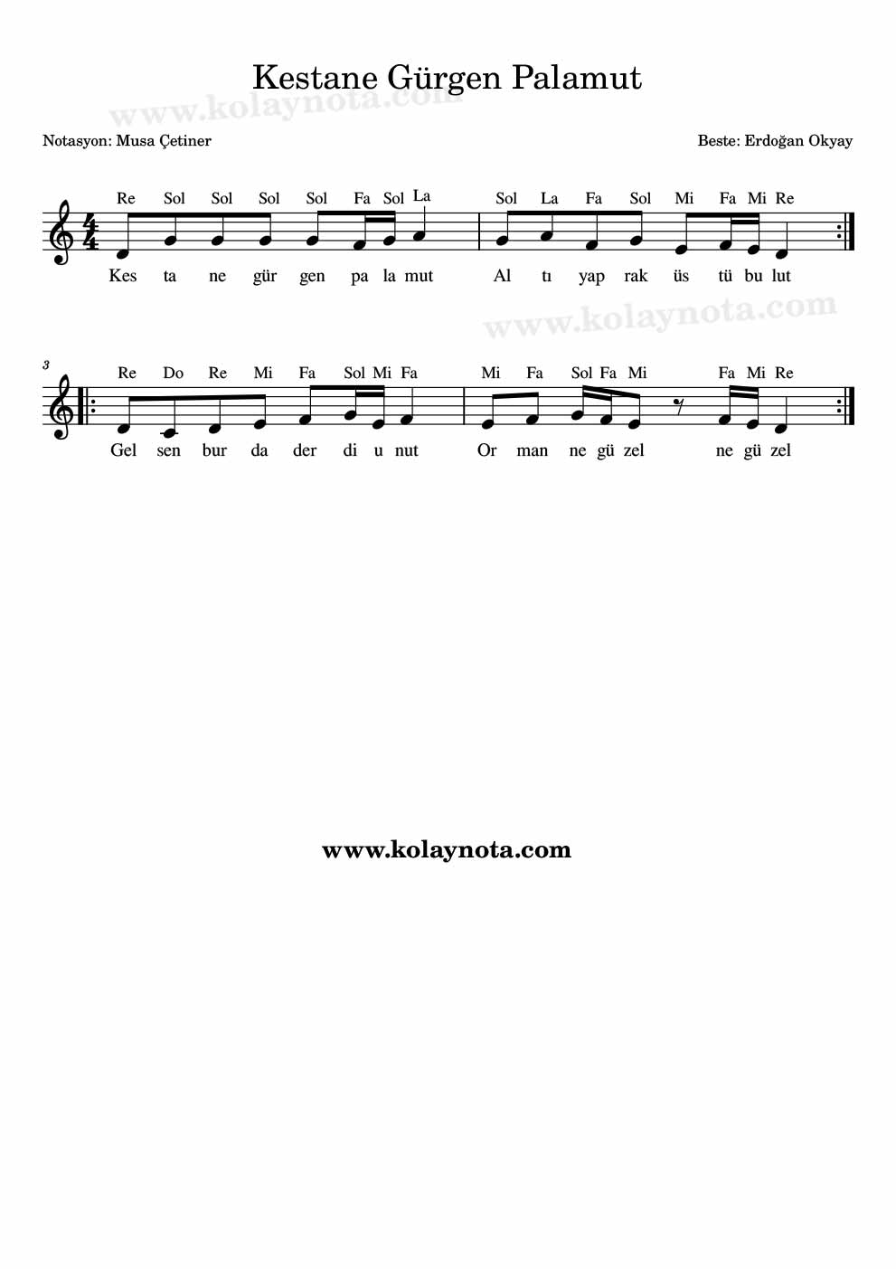 Bestesi Erdoğan Okyay’a ait olan bir çocuk şarkısı. Re karar sesinde notaya aldım. Melodika, keman, flüt, org gibi çalgılarda çalabilir, melodiyi dinleyebilirsiniz.