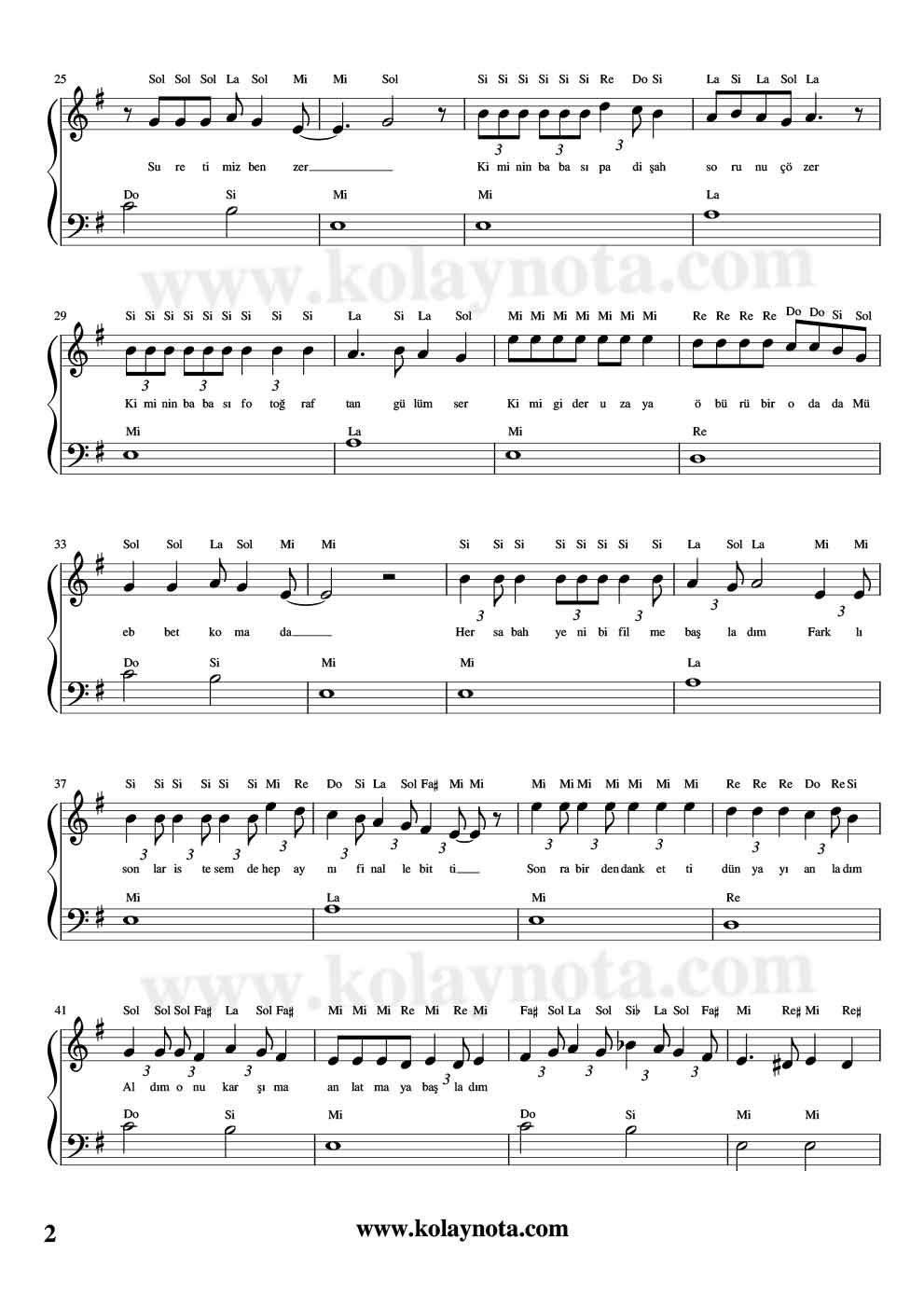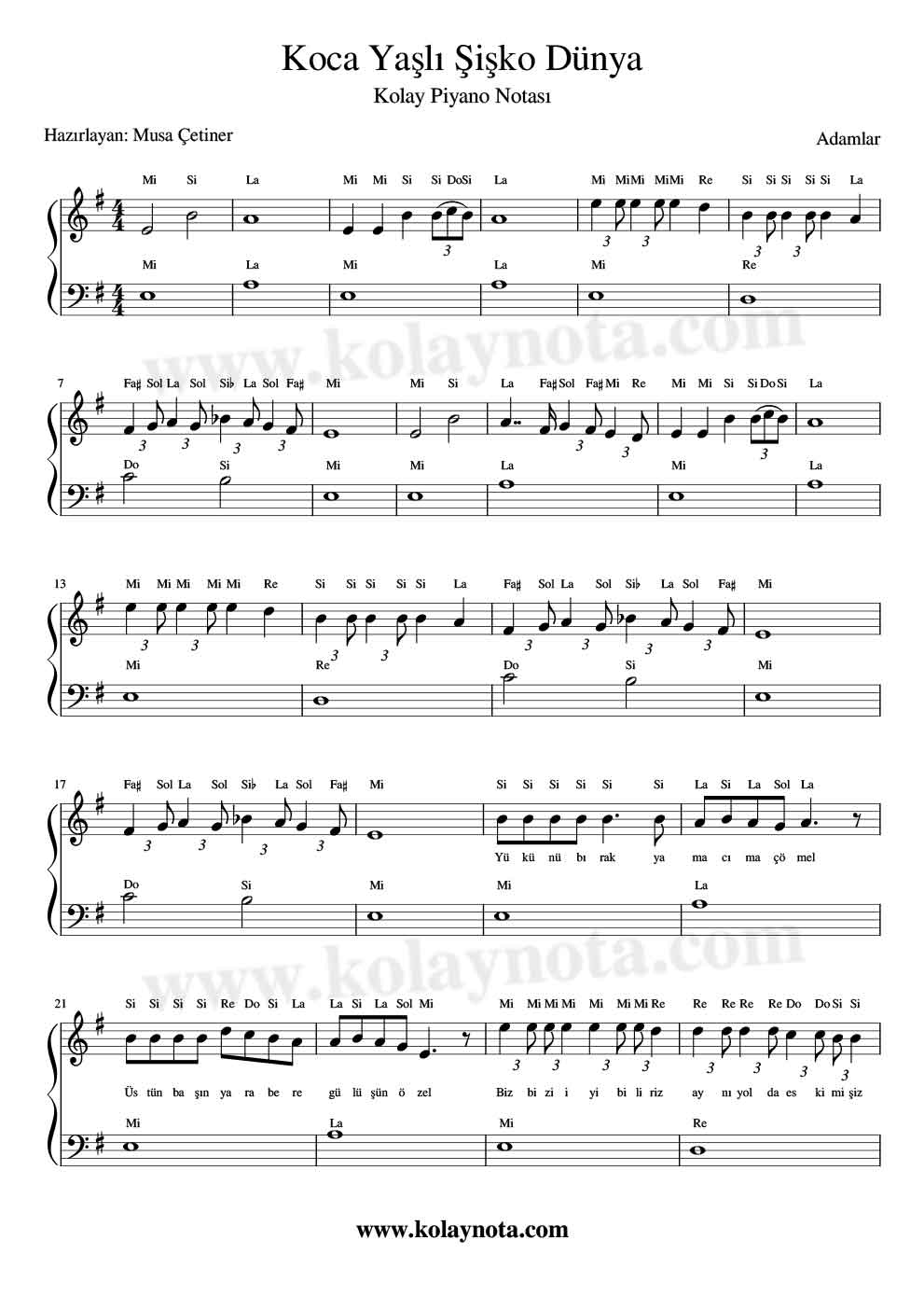 Adamlar grubunun sevilen bir şarkısı. Kolay piyano düzenlemesini paylaşacağım bu yazıda. Şarkının orjinal tonu Mi Minör, aynı tonda düzenlemeyi hazırladım. Her ne kadar piyano notası olsa da diğer çalgılarda da çalabilirsiniz. Üstteki satırları takip etmeniz yeterli. Düzenlemenin video linkini de ekleyeceğim, izlemeyi ihmal etmeyin. Başarılar.