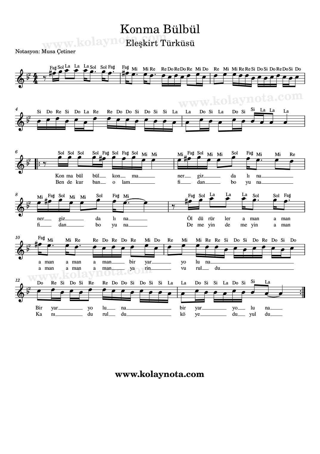 Konma Bülbül Konma – Nota