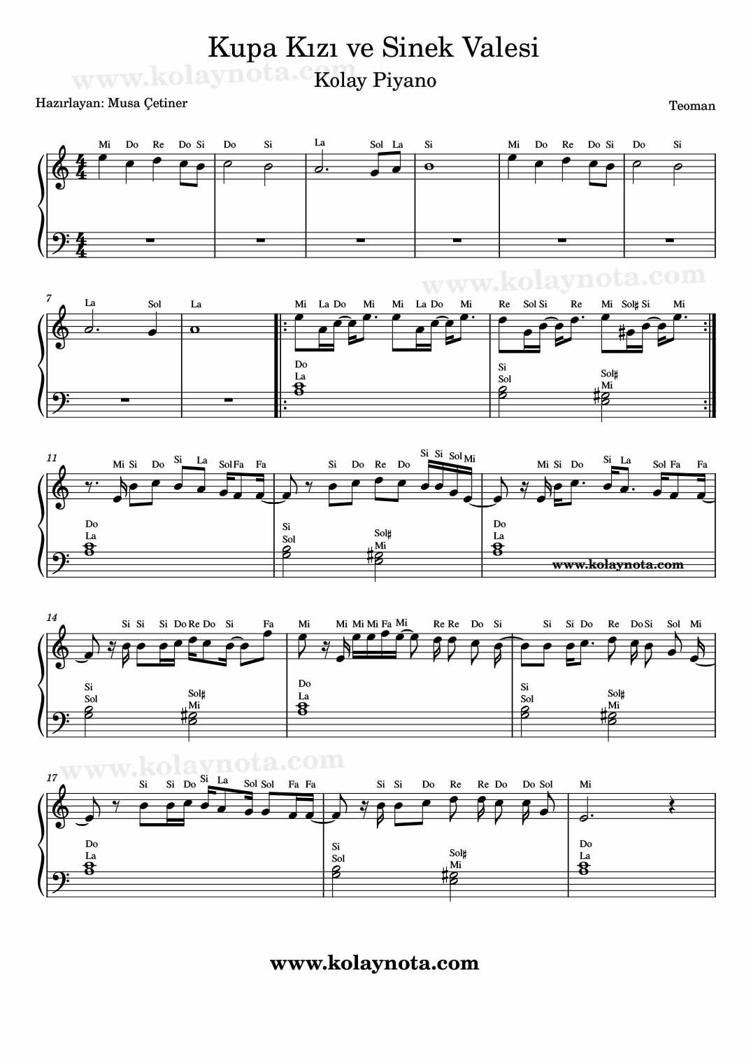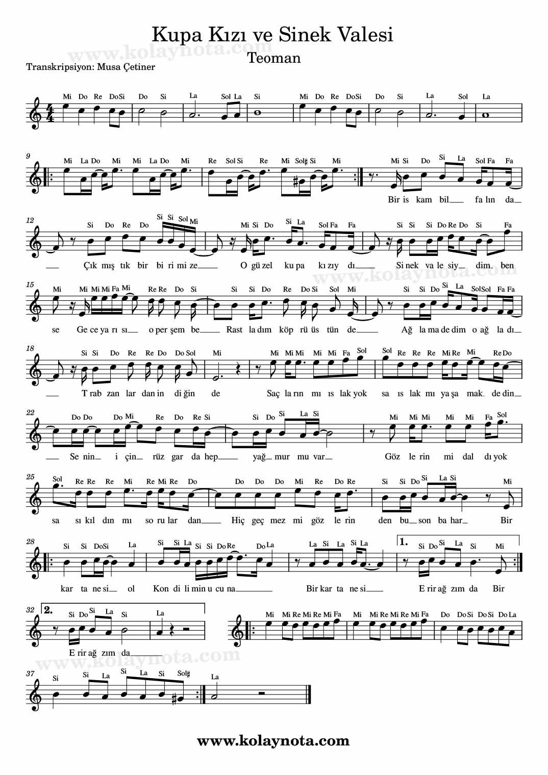 Kupa Kızı ve Sinek Valesi, Nota. Teoman’ın bir şarkısı. Deniz Özbey Akyüz (Vega) ve Teoman işbirliğiyle ortaya çıkmış. Şarkı sanatçının 2003 yılında çıkan “Teoman” adlı albümünde yer almış. Sol# minör tonunda yorumlanmış. Ben La minör tonunda notaya aldım. Kolay Nota ve Piyano düzenlemesini görebilirsiniz yazının içeriğinde.