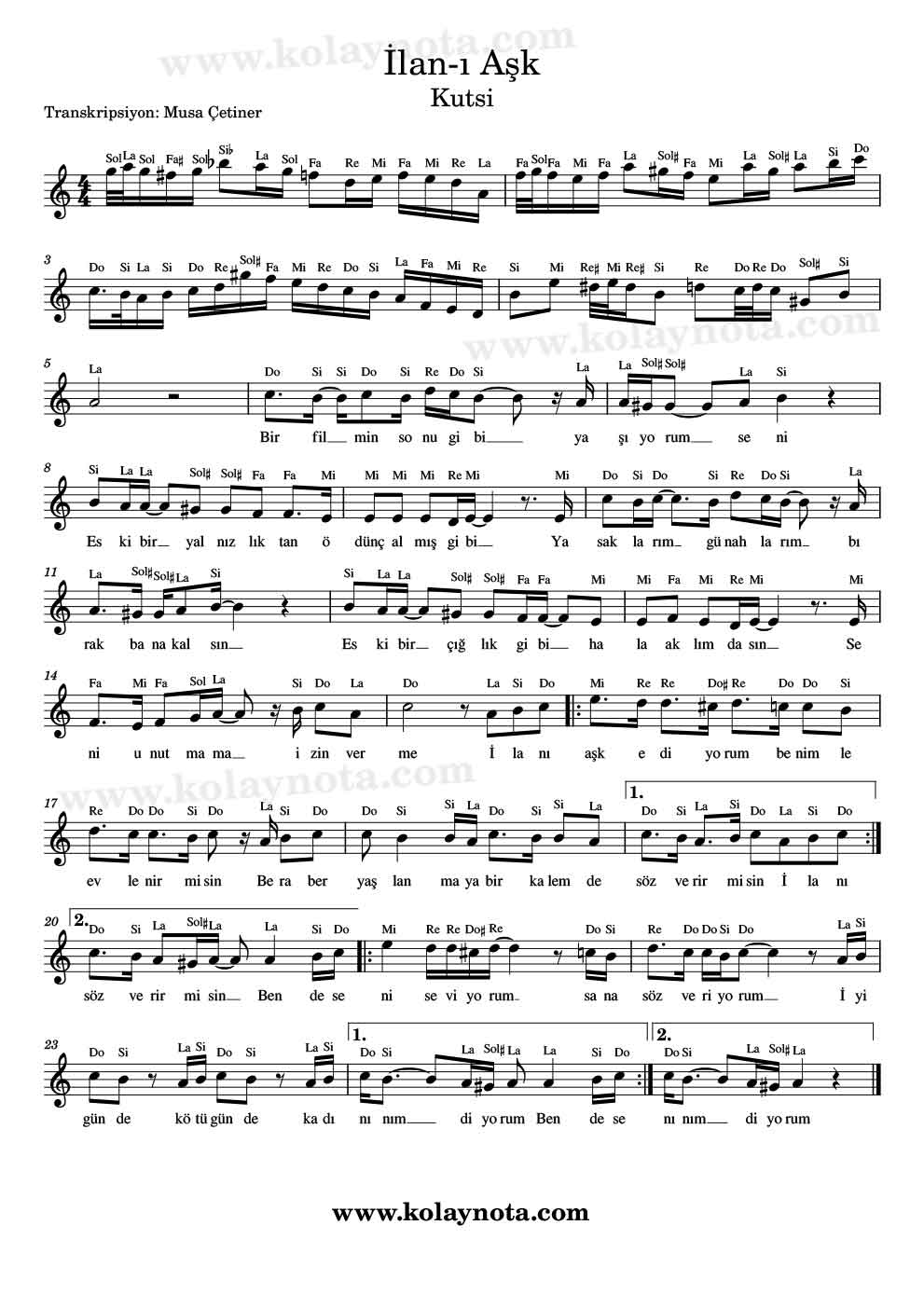 İlan-ı Aşk; sözü ve müziği Kutsi’ye ait olan bir şarkı. Nihavend makamında ve 4/4 ölçü birimine sahip. La Karar sesinde notaya aldım. Şarkı Kutsi’nin 2007 yılında çıkan “Aynı Şehirde Nefes Almak Bile Bana Yetiyor” albümünde yer almış. Nota çalıcısını da ekleyeceğim, dinleyip doğru bir şekilde çalışabilirsiniz.