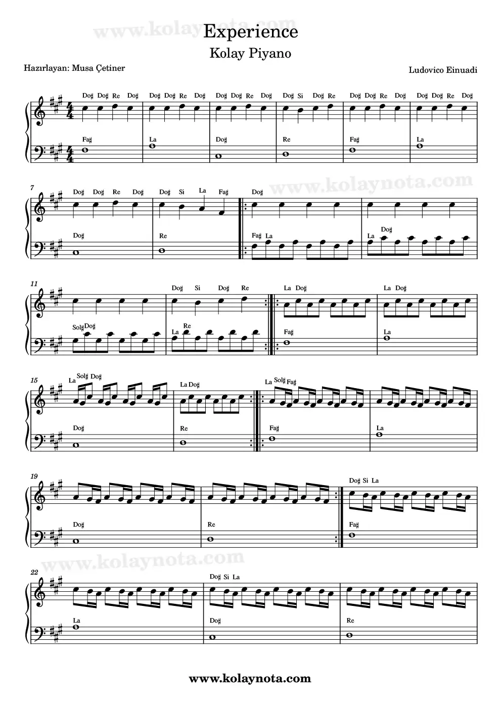 Ludovico Einaudi’nin Experience şarkısını piyanoya merakli müzikseverler bilecektir. Şarkının tonu Fa# minör, orjinal tonda kolay bir piyano düzenlemesini hazırladım. Sol elde tek sesli bir eşlik var. Olabildiğince şarkının karakterini bozmadan kolaylaştırmaya çalıştım.