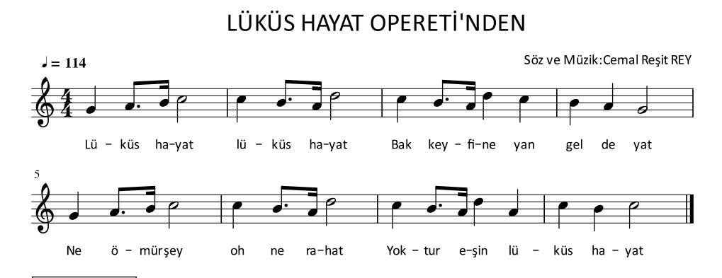 Lüküs Hayat; Cemal Reşit Rey‘in 1933 yılında bestelediği bir müzikal. Gerekli bilgi için buraya tıklayabilirsiniz. Do Re Mi Notaları ve Kolay notasını paylaşacağım. İkisi de Do majör tonunda olacak.