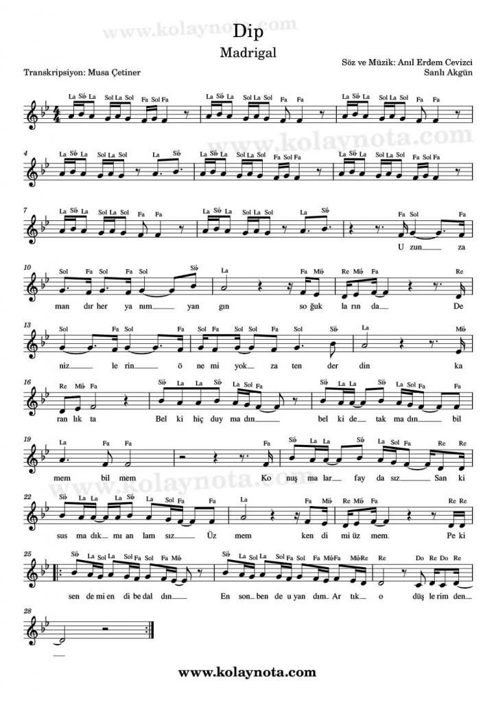 Dip; son zamanların yükselen grubu Madrigal’in bir şarkısı. Söz ve müziği Anıl Erdem Cevizci ile Sanlı Akgün’e ait. Kürdi dizisi üzerine bestelenmiş bir şarkı. Re karar sesinde yorumlanmış, aynı karar seste notaya aldım. Melodinin tekrar ettiği bölümleri yazmadım, sözler farklı olsa da melodi aynı kalıyor. Dinleyerek çözebilirsiniz o bölümleri. Yazının devamında Kolay nota ve piyano notasını görebilirsiniz.