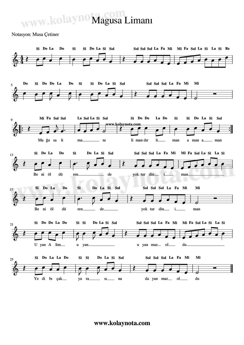 Magusa Limanı türküsünü melodika, keman, org, flüt gibi çalgılarda, do re mi nota ve kolay notasına bakarak doğru şekilde çalabilirsiniz.