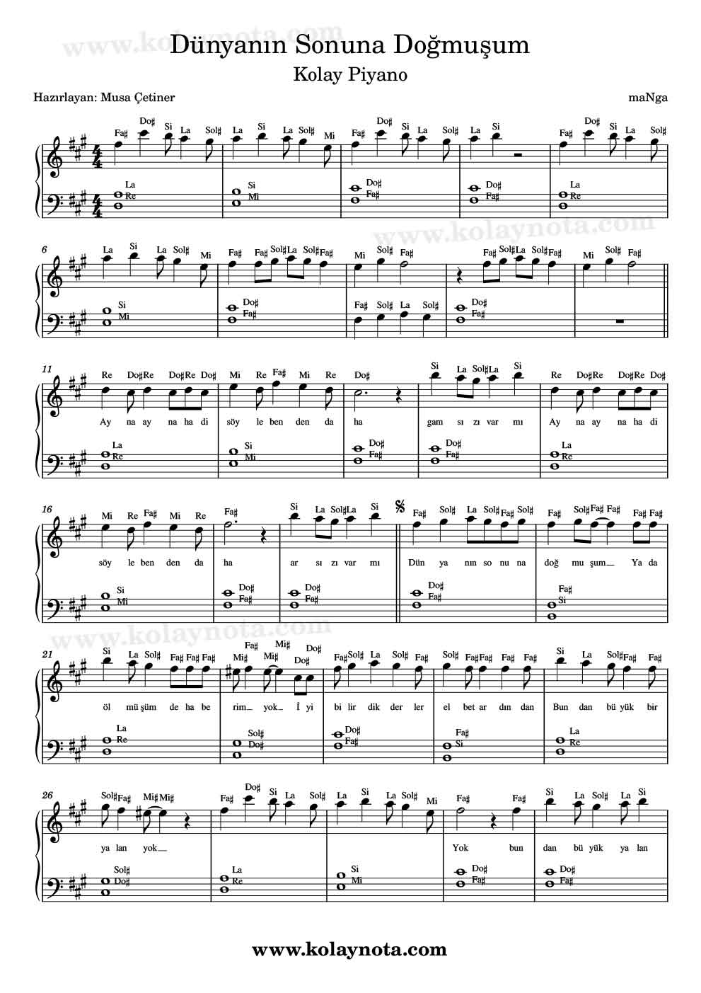 Dünyanın Sonuna Doğmuşum; maNga grubunun bir şarkısı. Grubun 2009 yılında çıkan “Şehr-i Hüzün” albümünde yer almış. Fa# minör tonunda bir şarkı. Aynı tonda notaya aldım. Şimdilik sadece piyano notasını hazırladım. Fakat melodiyi her çalgıda çalabilirsiniz.