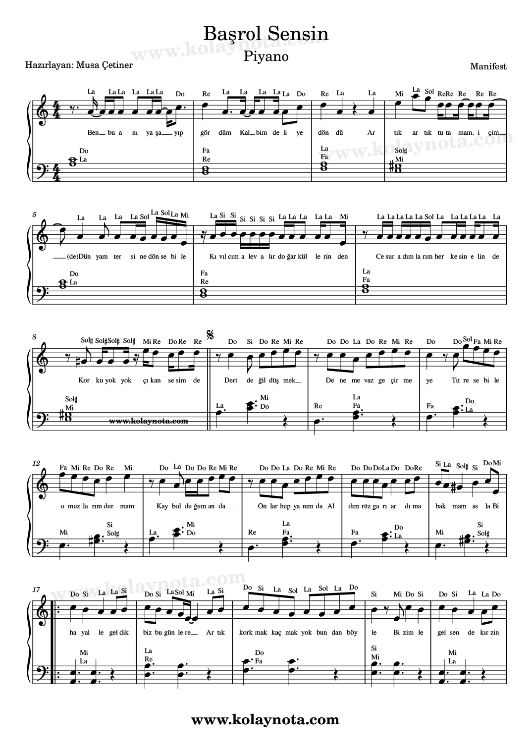 Başrol Sensin, Nota. manifest grubunun şarkısı. Söz ve müzikte grup üyelerinin imzası var. Do# minör tonunda yorumlanmış, ben La minör tonunda notaya aldım. Şimdilik sadece piyano notasını koyuyorum fakat melodiyi keman, melodika, füt, org gibi çalgılarda da çalabilirsiniz.