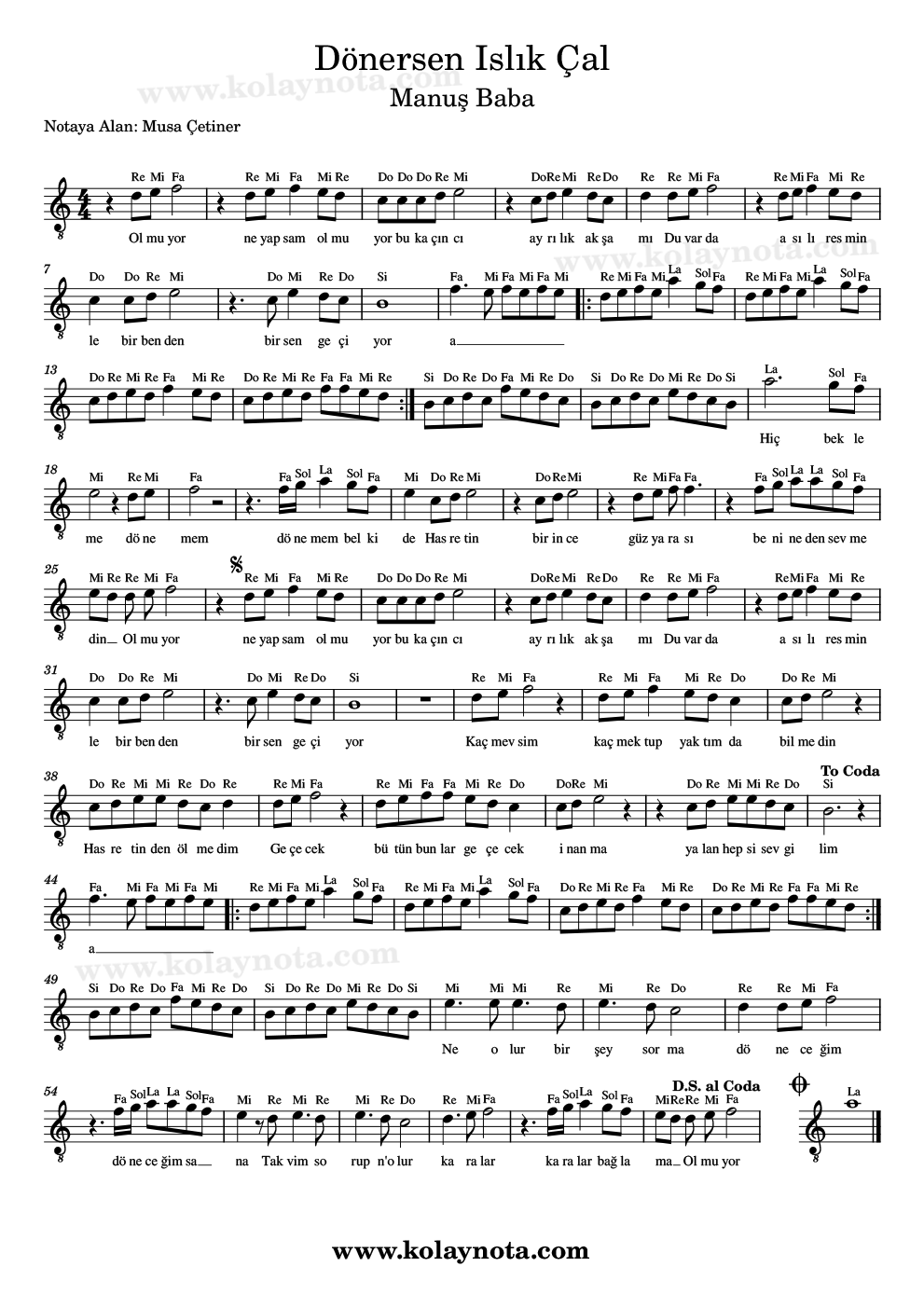 Dönersen Islık Çal, Nota. Manuş Baba’nın bir şarkısı. Do karar sesinde yorumlanmış, ben La karar sesinde notaya aldım. Kolay notasyonunu görebilirsiniz yazının içeriğinde. Keman, piyano, melodika, flüt, org gibi çalgılarda çalabilir, PDF ve imaj formatlarında indirebilirsiniz.