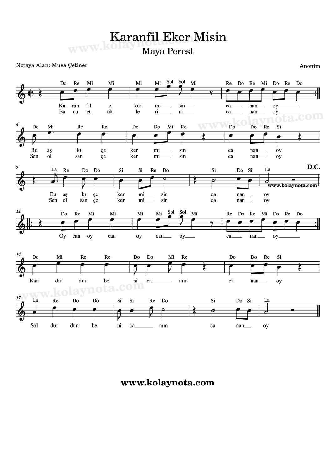 Karanfil Eker Misin, Nota. Maya Perest’in de yorumladığı bir türkü. Diyarbakır yöresine ait ve Hüseyni makamında. La karar sesinde notaya aldım. Bağlama gibi çalgılarda Si notasını komalı çalmalısınız. Notasyonu PDF ve imaj formatında görebilir, keman, melodika, flüt, org, piyano gibi çalgılarda çalabilirsiniz.