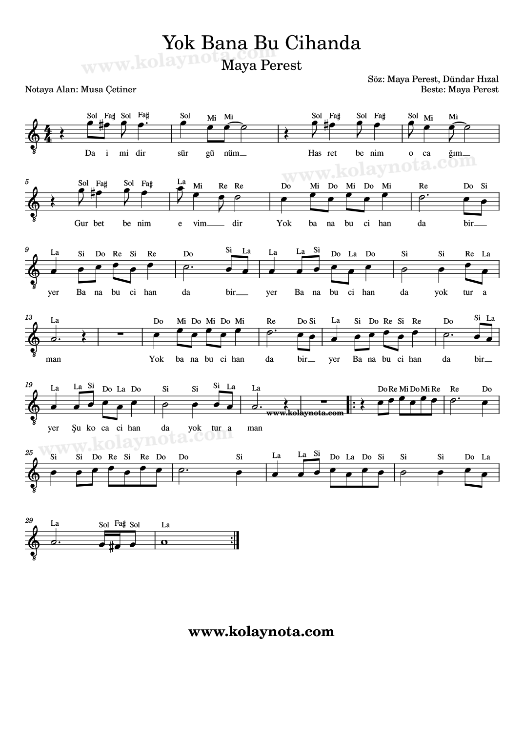 Maya Perest – Yok Bana Bu Cihanda – Nota
