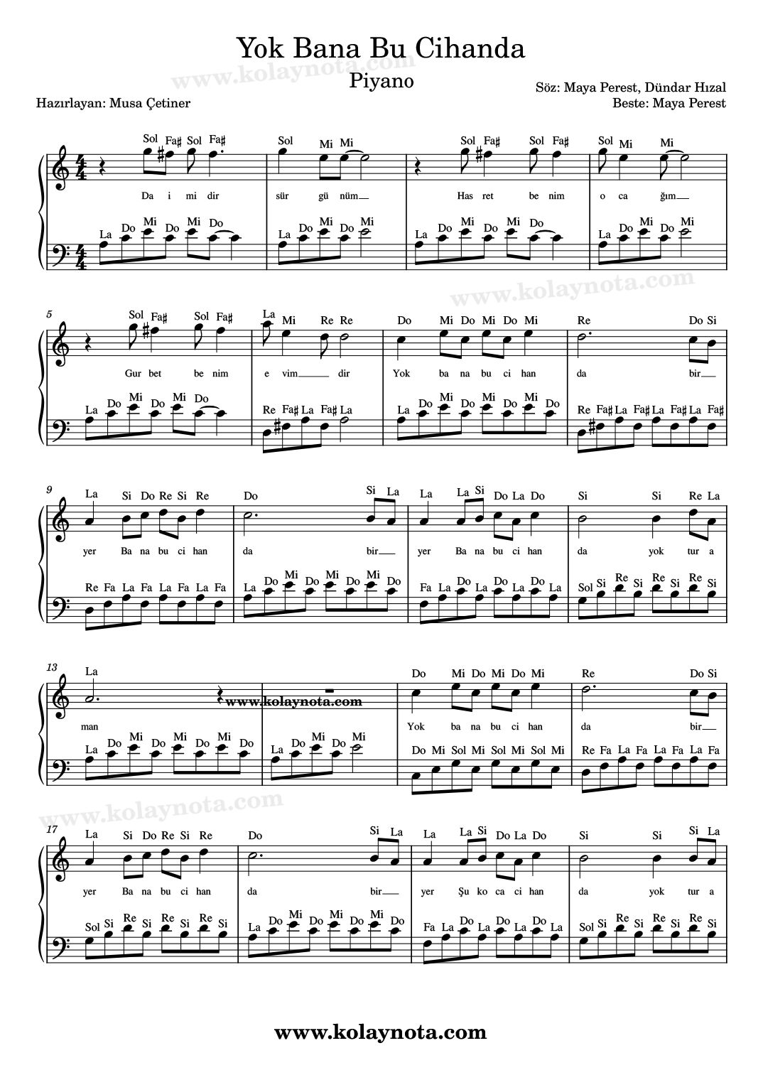 Yok Bana Bu Cihanda, Nota. Maya Perest’in bir şarkısı, sözü ve müziği kendisine ait. Sözlerde Dündar Hızal’ın da katkısı var. Fa# karar sesinde okunmuş, ben La karar sesinde notaya aldım. PDF ve imaj biçimlerinde görüntüleyebilir, keman, piyano, melodika, flüt, org gibi çalgılarda çalabilirsiniz.