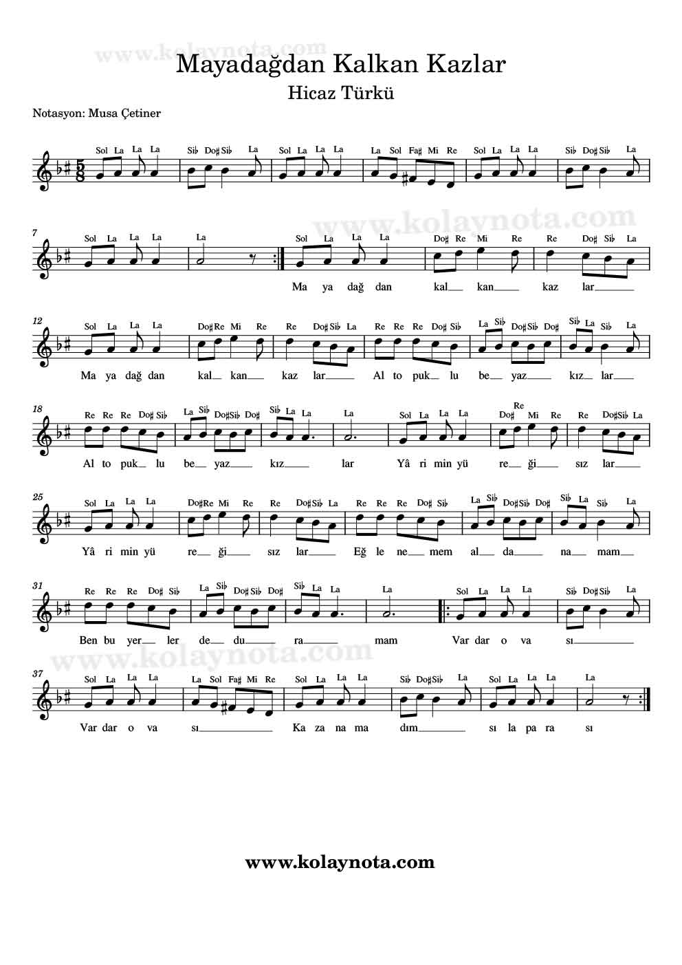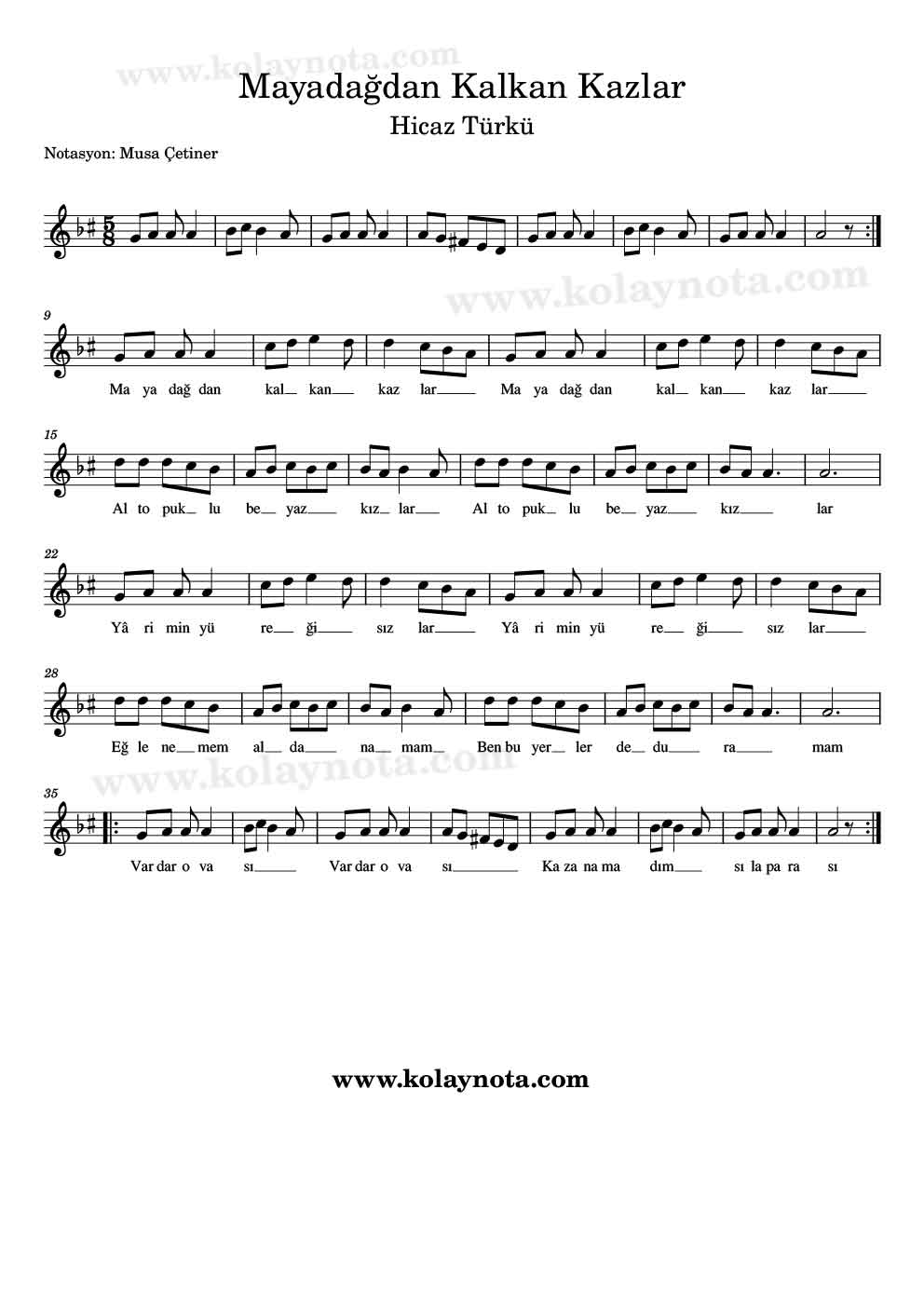 Mayadağdan Kalkan Kazlar; Hicaz makamında, 5/8 ölçü birimine sahip bir Rumeli türküsü. Kolay Nota ve Do Re Mi notasyonu hazırladım. Her iki notasyon da La Karar sesinde.