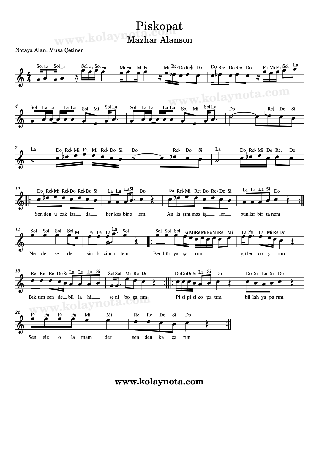 Piskopat, Nota. Mazhar Alanson’un Cem Yılmaz’la düet yaptığı bir şarkı. Do karar sesinde notaya aldım. Eğlenceli bir şarkı, çalmadan önce mutlaka dinleyiniz.