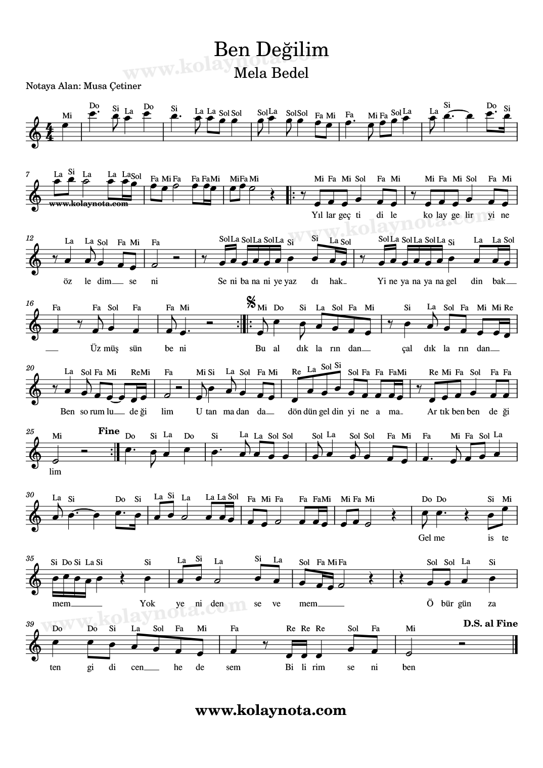 Ben Değilim – Kolay Nota by Musa Çetiner