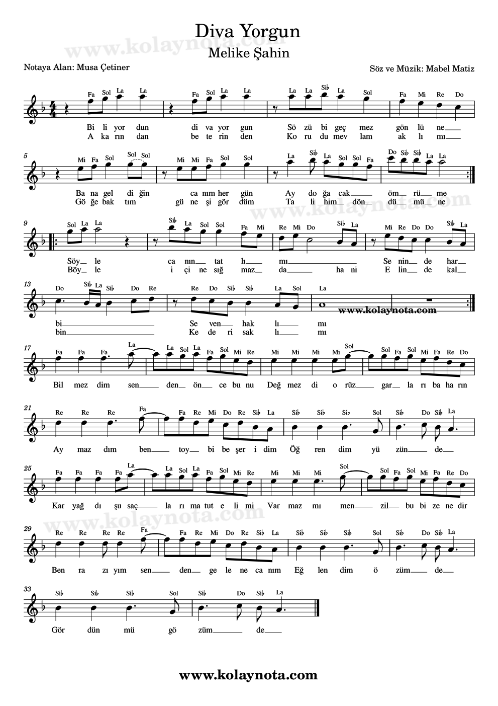 Diva Yorgun, Nota. Sözü ve müziği Mabel Matiz’e ait olan bir Melike Şahin şarkısı. Kürdi makamında bestelenmiş ve La Karar sesinde okunmuş, aynı karar seste notaya aldım. Keman, melodika, flüt, piyano, org gibi çalgılarda çalabilir, PDF ve imaj biçimlerinde görüntüleyebilirsiniz.