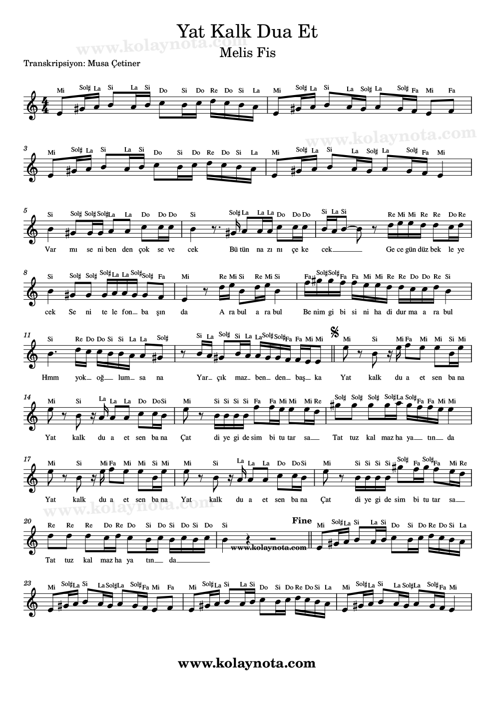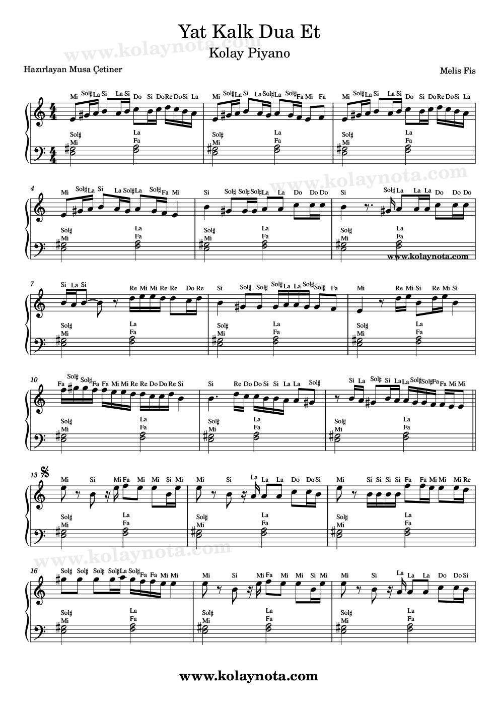Yat Kalk Dua Et, Nota. Melis Fis’in bir şarkısı. Hicaz makamında bestelenmiş ve Fa karar sesinde okunmuş. Be Mi karar sesinde notaya aldım. Kolay ve piyano düzenlemesini görebilirsiniz. Keman, melodika, flüt, org gibi çalgılarda çalabilir, PDF ve imaj biçimlerinde görüntüleyebilirsiniz.