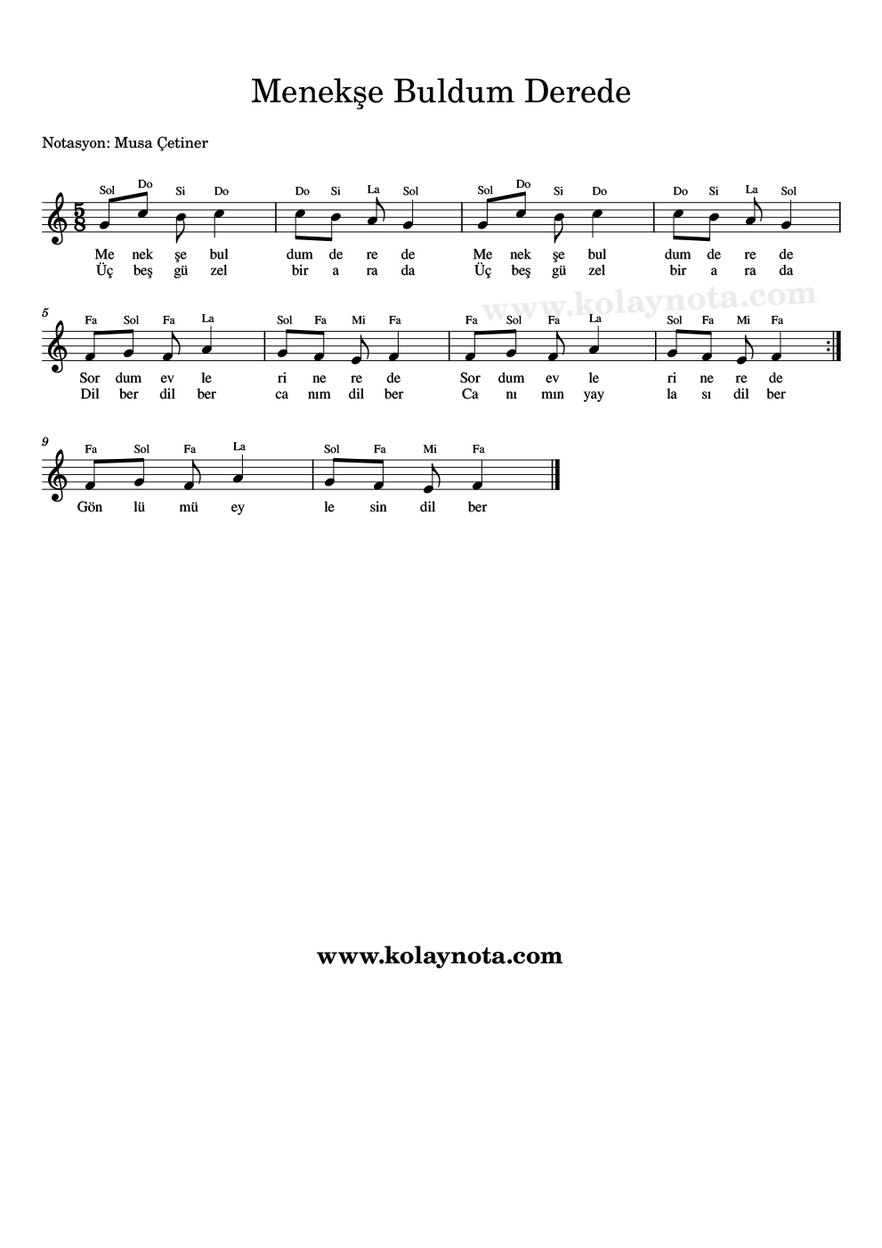 Menekşe Buldum Derede, Nota. Tekerleme türünde bir şarkı. Fa Karar sesinde notaya aldım. Keman, melodika, flüt, org gibi çalgılarda çalabilirsiniz.