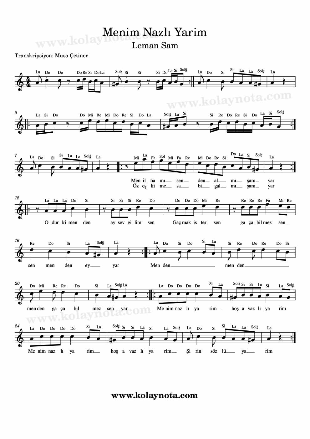 Menim Nazlı Yarim, Nota. Azerbaycan yöresine ait anonim bir şarkı. Nihavend makamında bir eser. Leman Sam’ın kaydını dinleyerek notaya aldım. La Karar sesinde do re mi ve kolay notasını görebilirsiniz. Notasyonu keman, melodika, flüt, bağlama, org gibi çalgılarda doğru bir şekilde çalabilirsiniz.