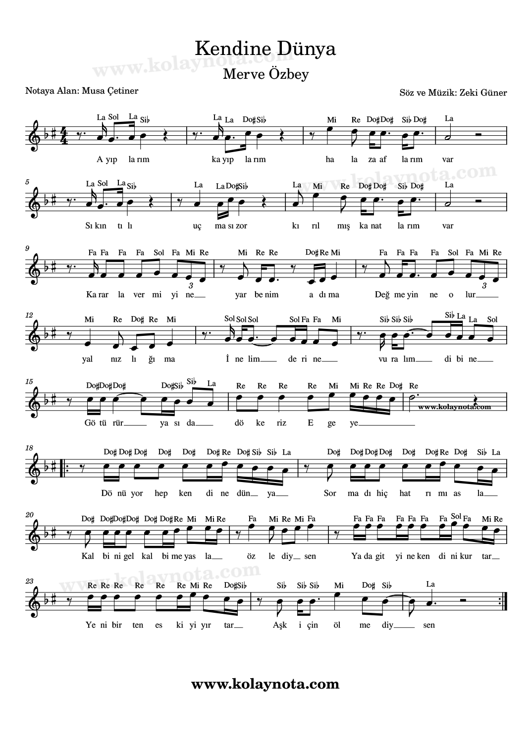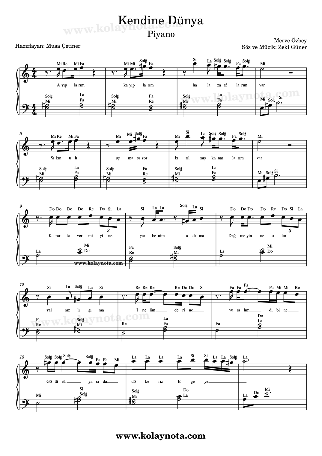 Kendine Dünya, Nota. Merve Özbey’in bir şarkısı. Sözü ve müziği Zeki Güner’e ait. Hicaz makamında bestelenmiş, Fa# karar sesinde yorumlanmış. Ben La karar sesinde notaya aldım. PDF ve imaj biçiminde görebilir, keman, flüt, bağlama, ud, org, melodika gibi çalgılarda çalabilirsiniz. Şarkıyı bilmiyorsanız Nota Oynatıcısında dinleyerek doğru bir şekilde çalışabilirsiniz. Soru ve isteklerinizi yorumlara yazmayı unutmayın.