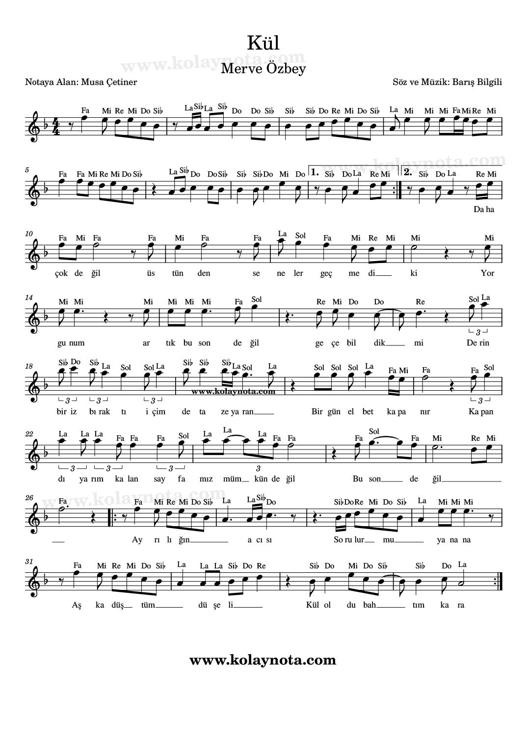 Kül, Nota. Merve Özbey’in şarkısı. Sözü ve müziği Barış Bilgili’ye ait. Kürdi dizisi üzerine bestelenmiş. Si bemol karar sesinde söylenmiş, ben La karar sesinde notaya aldım. Keman, melodika, flüt, org, piyano gibi çalgılarda çalabilir, PDF ve imaj biçiminde görüntüleyebilir, notayı dinleyerek çalışabilirsiniz.