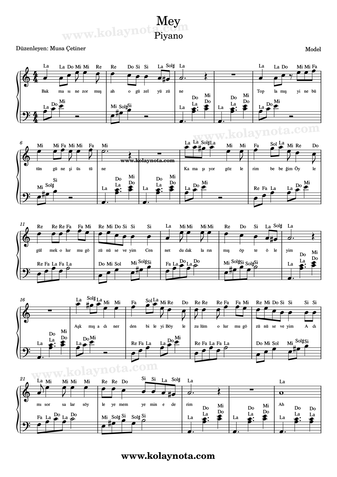 Mey; Model grubunun sevilen şarkılarından. Do Re Mi nota ve Kolay nota olarak hazırladım. Do Re Mi nota sadece nakarat bölümünü içeriyor. Kolay notasında bütün şarkı var. Nota oynatıcısını da ekleyeceğim şarkıyı çözmenizde faydası olacaktır.