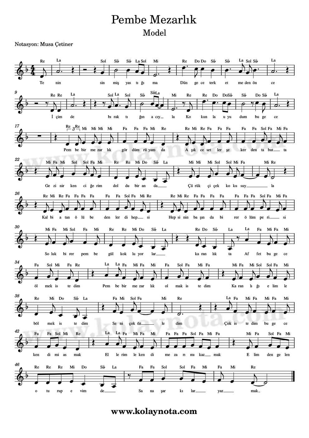 Pembe Mezarlık; Model grubunu çok sevilen bir şarkısı. Kolay Notası ve kolay piyano düzenlemesini paylaşacağım bu yazıda. Kolay notasını Re minör tonunda hazırladım. Keman, melodika, flüt, org gibi çalgılarda kolaylıkla çalabilirsiniz.