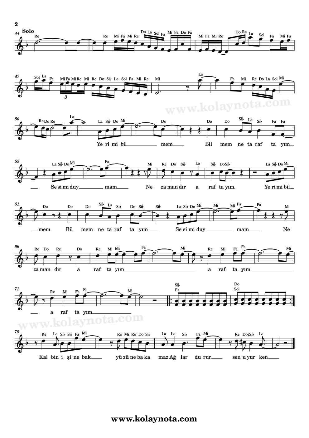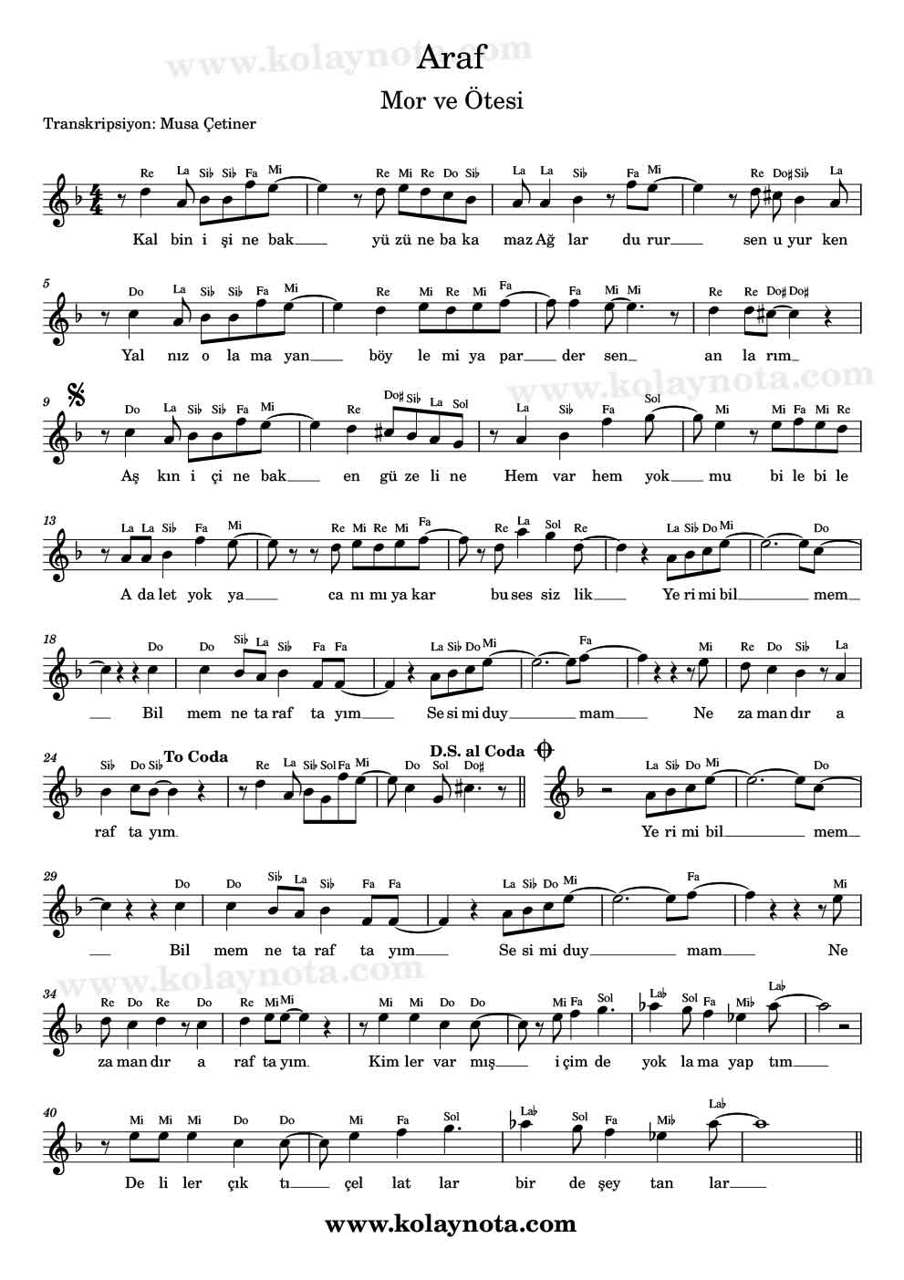 Araf: Mor ve Ötesi grubunun bir şarkısı. Grubun 2010 yılında çıkan “Masumiyetin Ziyan Olmaz” albümünde yer almış. Kürdi dizisi üzerine bestelenen bir şarkı. La Karar sesinde çalınmış, aynı tonda notaya aldım. Notasyonu dinleyerek doğru bir şekilde çalışabilirsiniz.