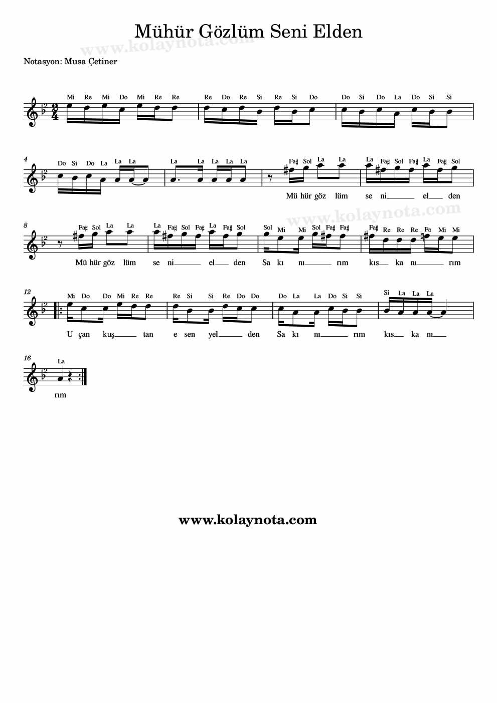 Mühür Gözlüm Seni Elden türküsünün notası bu yazının konusuydu. Türkü ve türkü formundaki eserleri seviyorsanız sitem notaya aldığım çok sayıda şarkıya ulaşabilir, keman, bağlama, ud, melodika, flüt, org gibi çalgılarda çalabilirsiniz. Soru ve isteklerinizi yorumlara yazabilirsiniz.