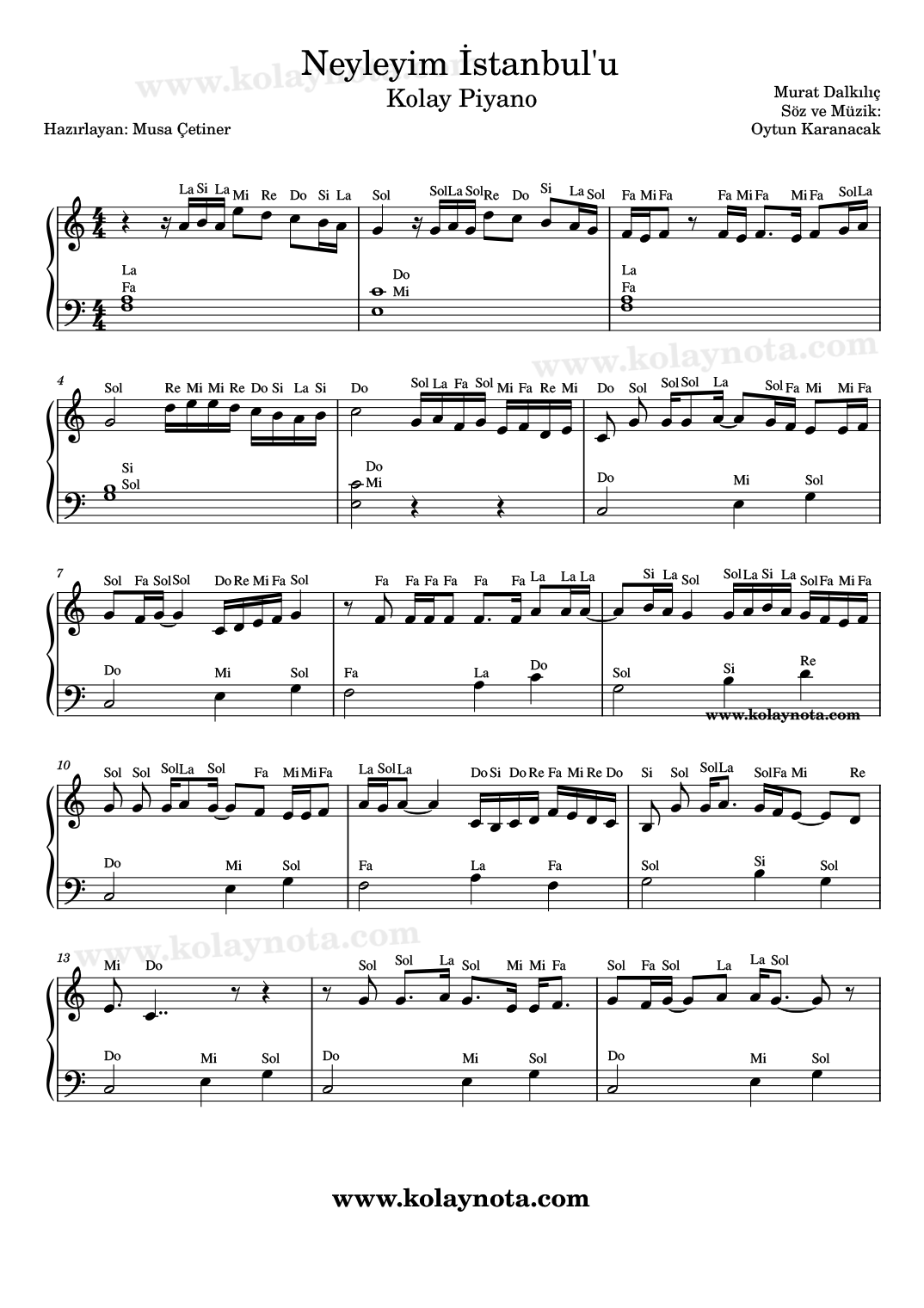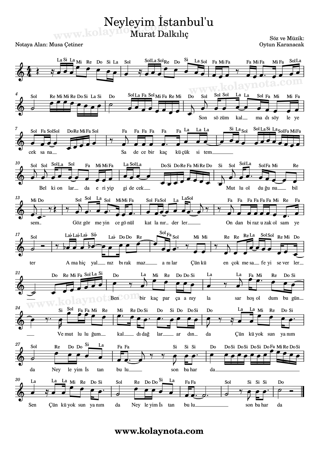 Neyleyim İstanbul’u, Nota. Murat Dalkılıç’ın çok sevilen bir şarkısı. Sözü ve müziği Oytun Karanacak tarafından yazılmış. Do Karar sesinde notasını yazdım. Keman, piyano, melodika, flüt, org gibi çalgılarda çalabilir, PDF ve imaj biçiminde görüntüleyebilirsiniz.