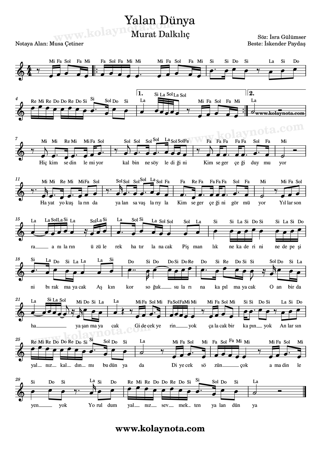 Yalan Dünya, Nota. Murat Dalkılıç’ın bir şarkısı. Bestesi İskender Paydaş, sözleri İsra Gülümser’e ait. Si minör tonunda bir şarkı, ben La minör tonunda notaya aldım. Keman, piyano, melodika, flüt, org gibi çalgılarda çalabilir, PDF ve imaj formatında görüntüleyebilirsiniz.