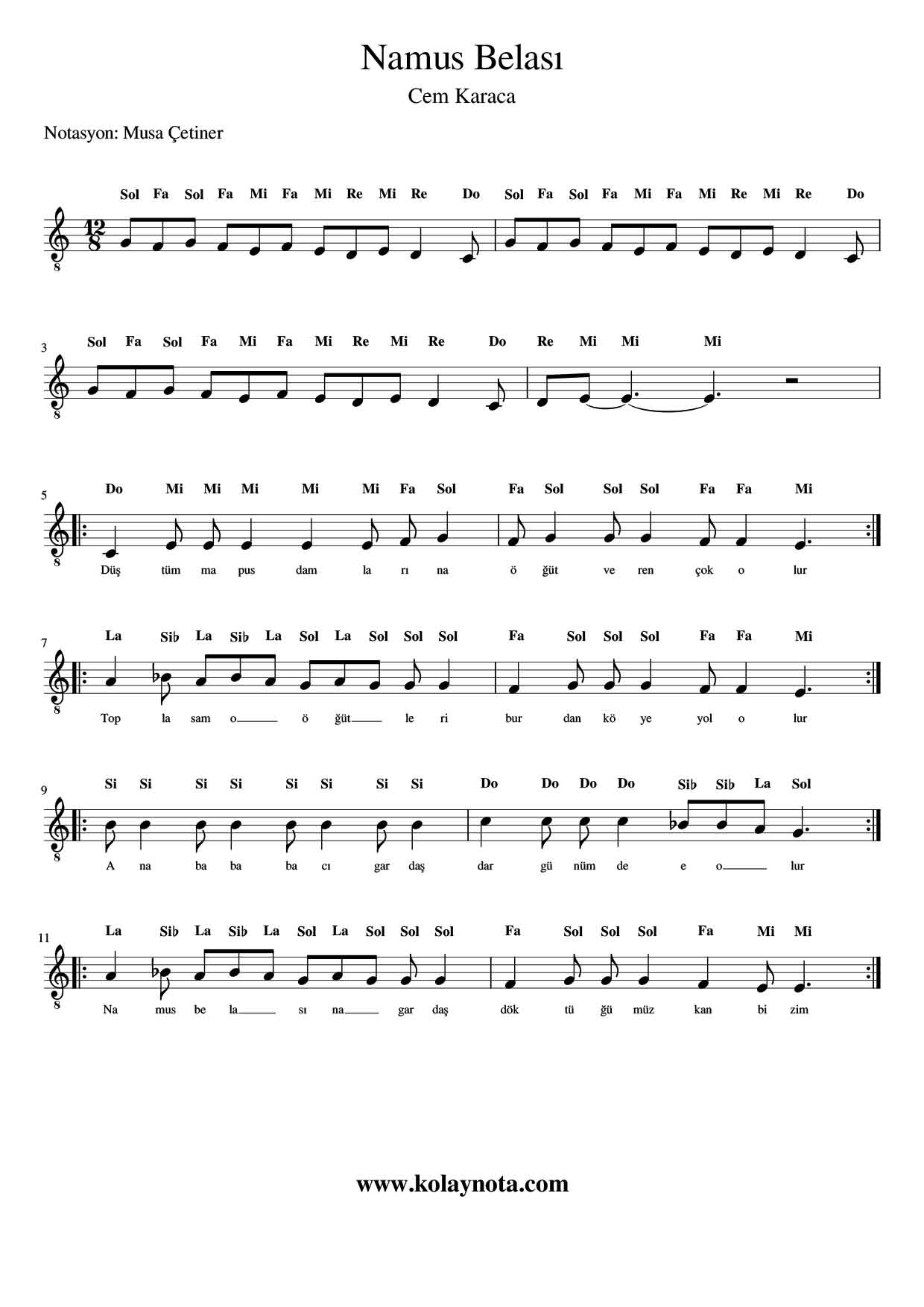 Namus Belası; çok bilinen bir Cem Karaca şarkısı. Do Re Mi ve kolay notalarını göreceksiniz bu yazıda. 2 notasyon da mi karar sesinde yazıldı. Do Re Mi notasyonda sadece sözlü bölümler var, kolay notası giriş bölümünü de içeriyor. Şarkının notalarını keman, melodika, flüt, org enstrümanlarında çalabilirsiniz. Başarılar.